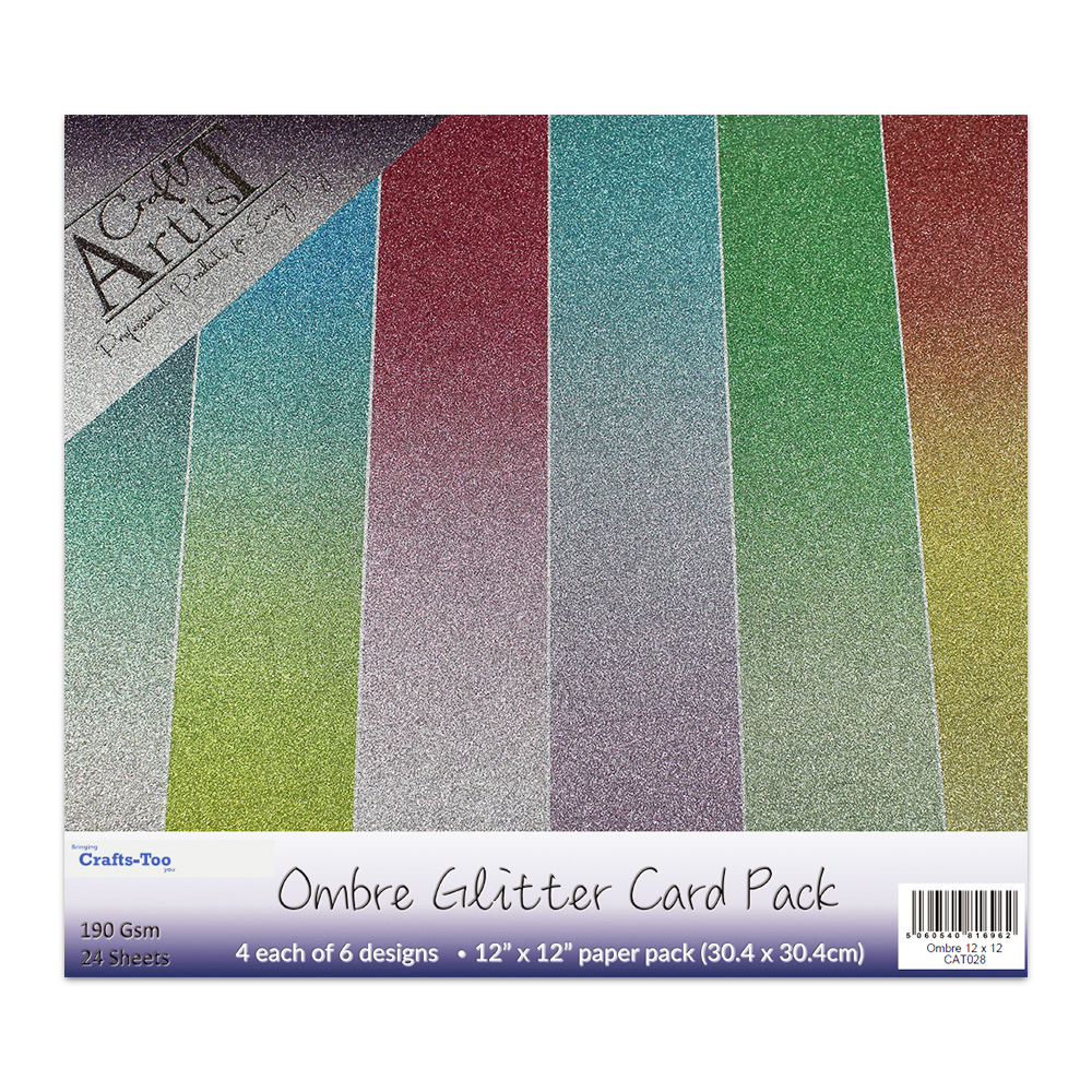 The Craft Artist Ombre Glitter Card 12″ x 12″ is a non shed glitter card for die cutting and craft projects, consists of 6 different Ombre colours, 4 of each colour totalling 24 high quality 12″ x 12″ sheets of 190gsm card.