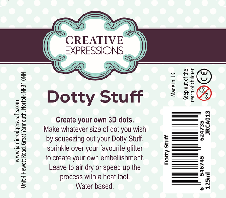 Dotty Stuff by Creative Expressions is a specially formulated to help you create your own dimensional embellishments with ease. Supplied in a generous 125ml bottle, this thick, high-tack glue is perfect for forming raised glitter dots, faux gems, and custom sparkly accents directly onto your craft projects.