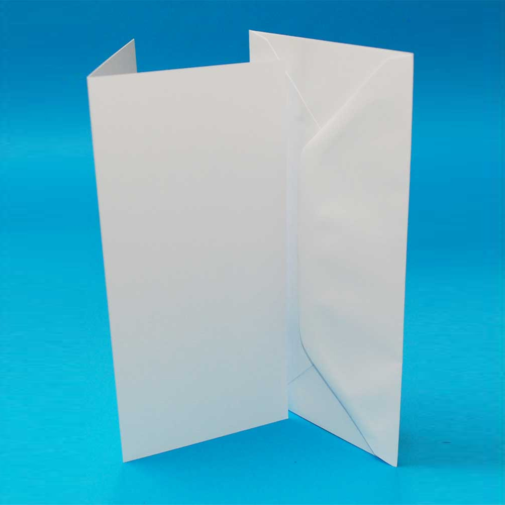 A pack of 50 white cards with matching envelopes. Cards have been scored in the centre for easy folding, and measure 210mm by 100mm when folded. Card weight is 225gsm. Envelopes measure 220mm by 110mm, and are 100gsm.