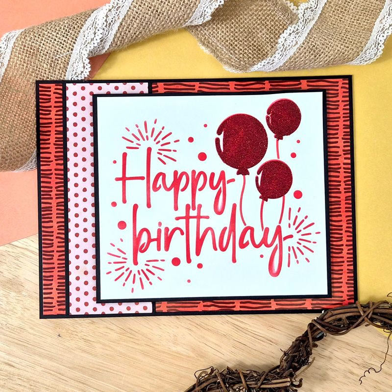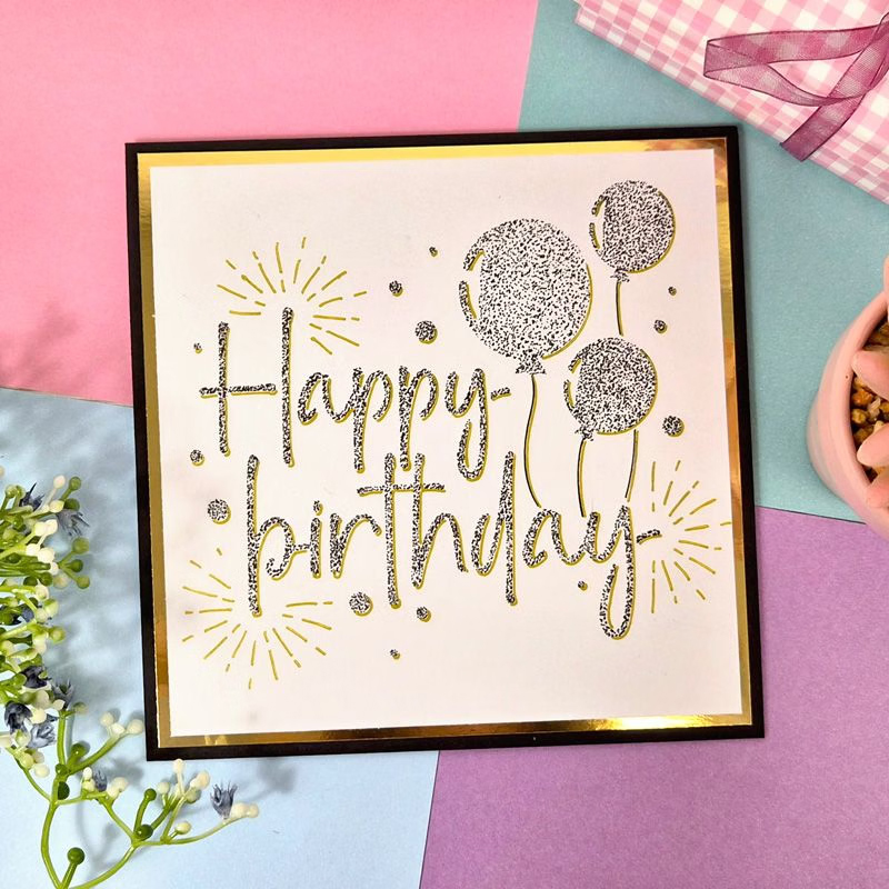 The mask features a striking sentiment decorated with balloons, dots and explosions. The sentiment beautifully sits on a 6” x 6” card, or larger. Simply ink through the mask using our range of Prism Ink Pads for a quick, but stunning, centrepiece or alternatively, mask off sections using Low-Tack Tape to ink elements or single words. Add extra texture to your centrepiece sentiment by pairing the mask with our Prism Texture Pastes, whether it’s a matt, metallic or glitter finish.