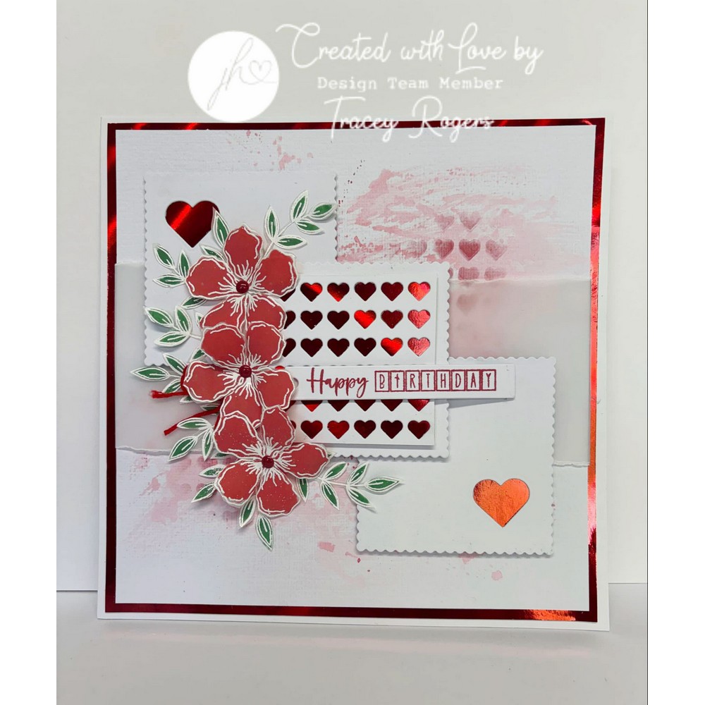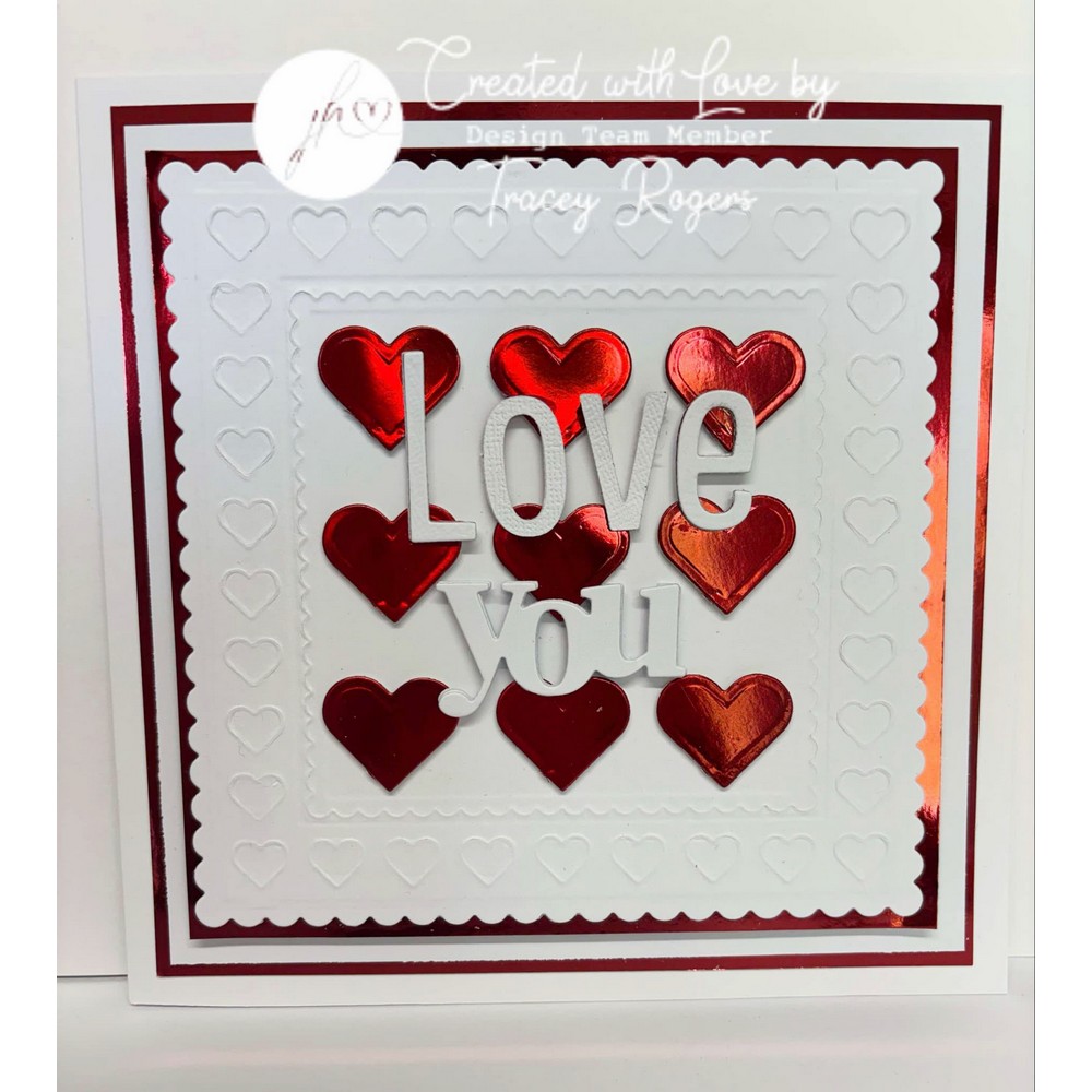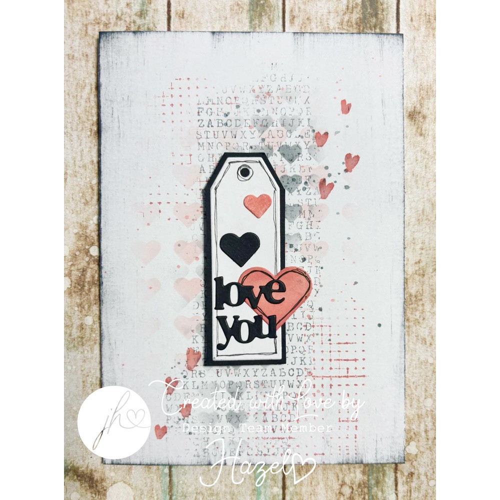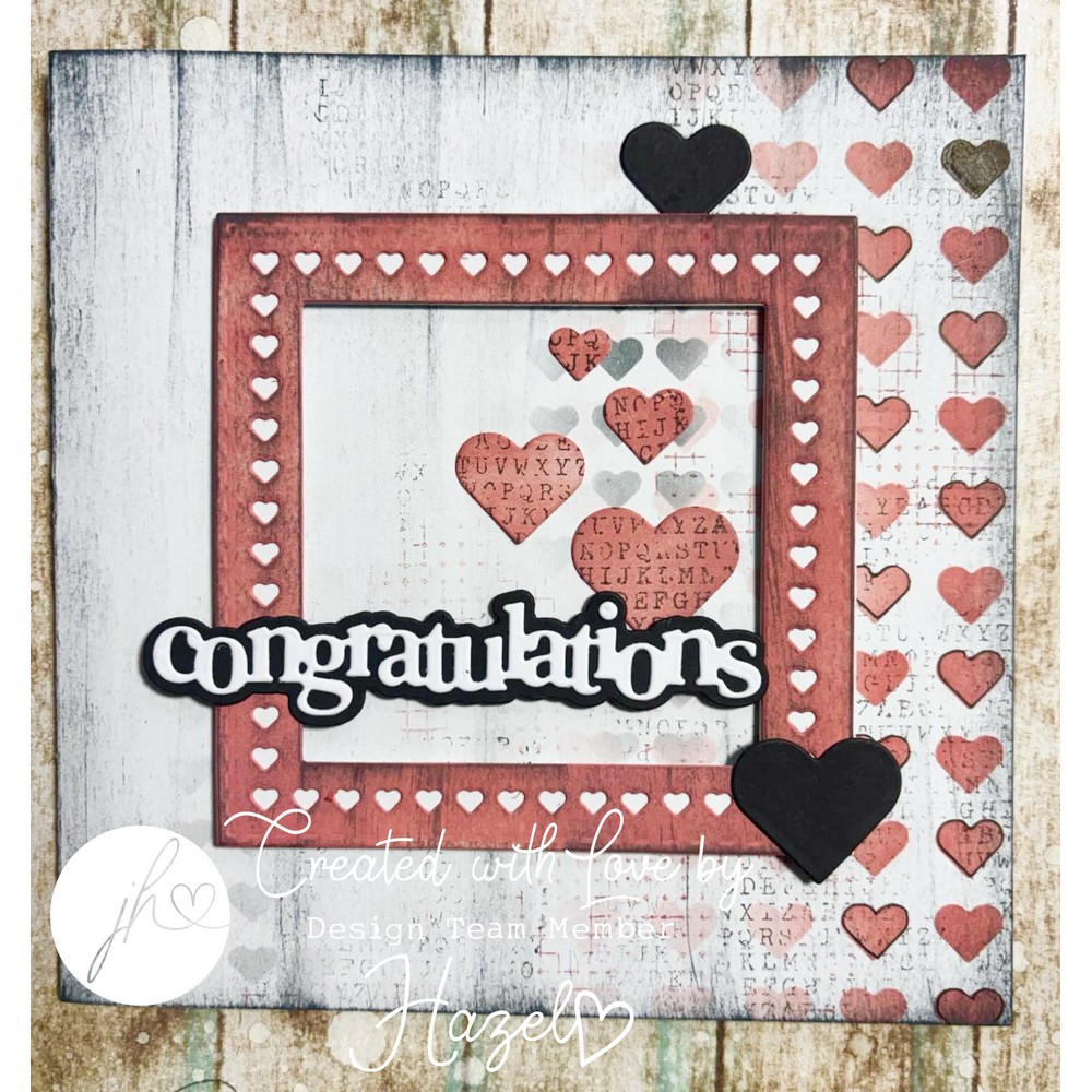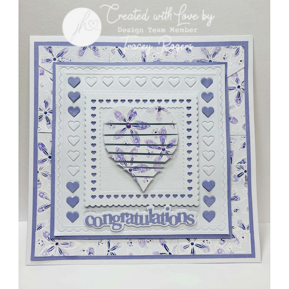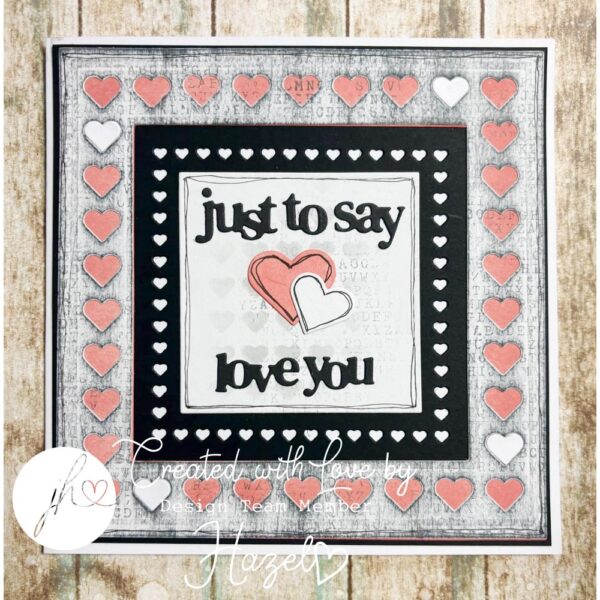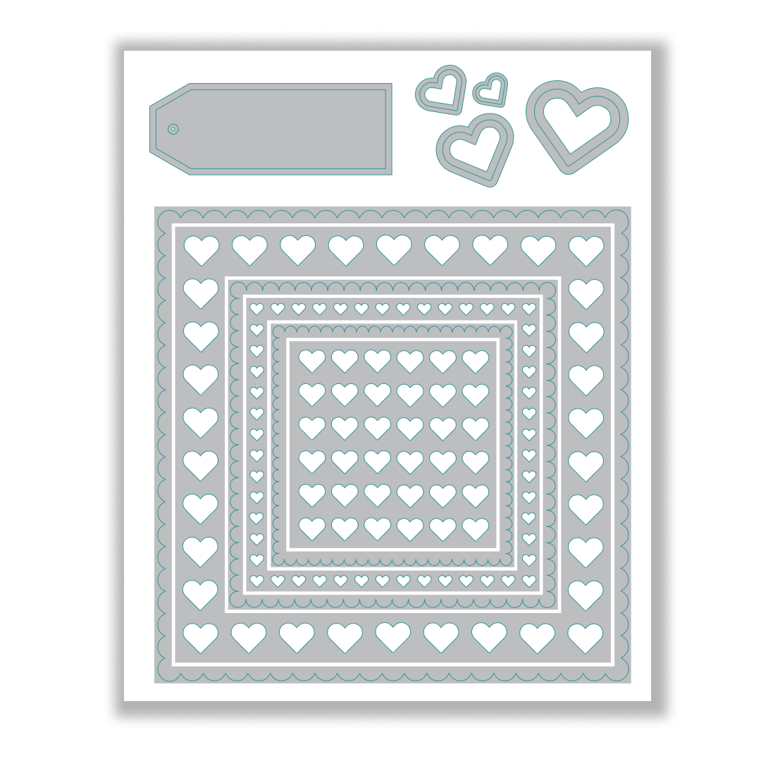 Hazel’s Heart Medley Die Set comprising: 11 individual dies, 6 layering square dies, 1 tag die and 4 heart dies. The largest heart die fits a 150mm x 150mm (6″x6″) card blank perfectly and all the aperture dies can be extended creating lots of different sizes. The dies can be using independently to create mats and layers into cards or they can be combined to create frames with heart apertures. The dies also make fabulous stencils to use for your card making.