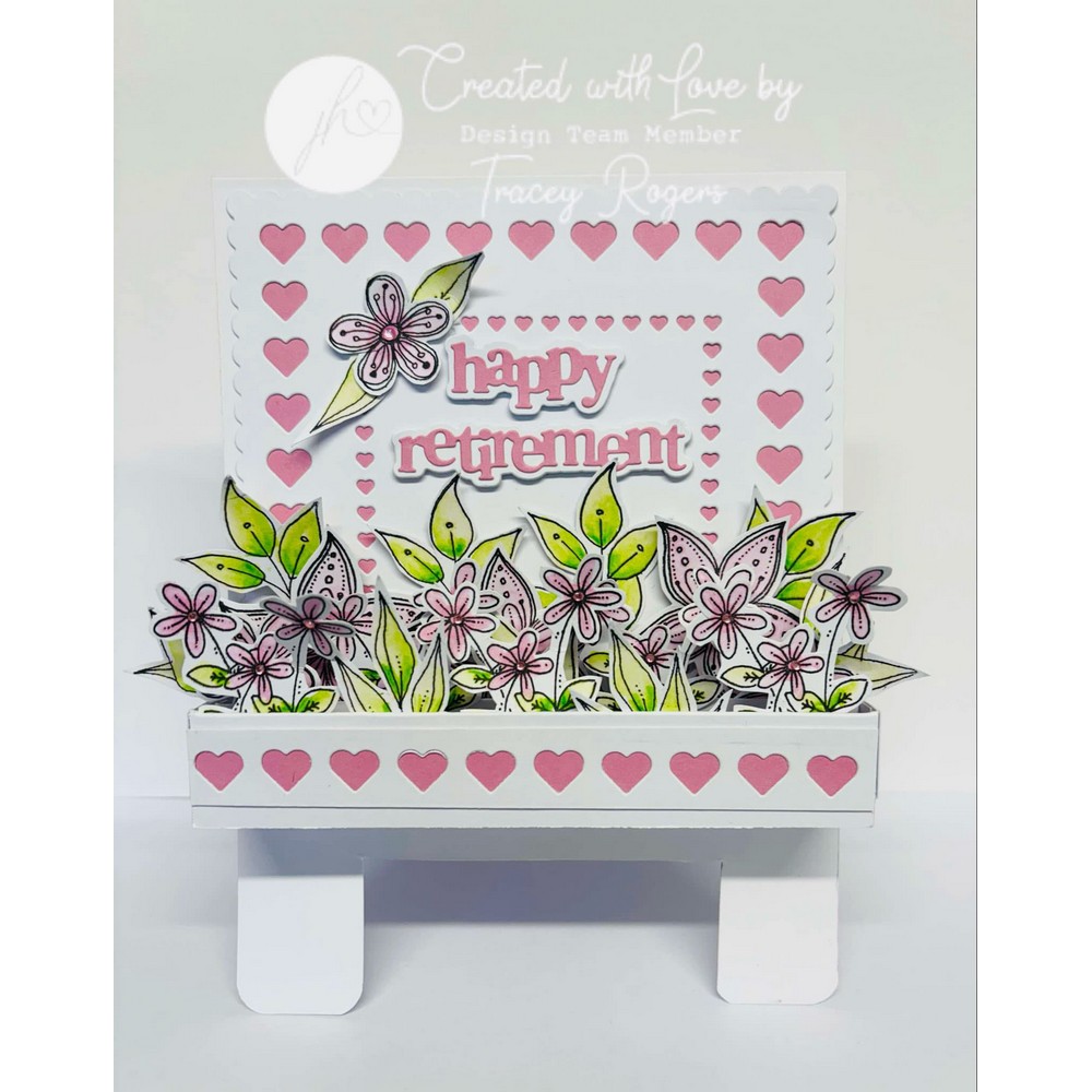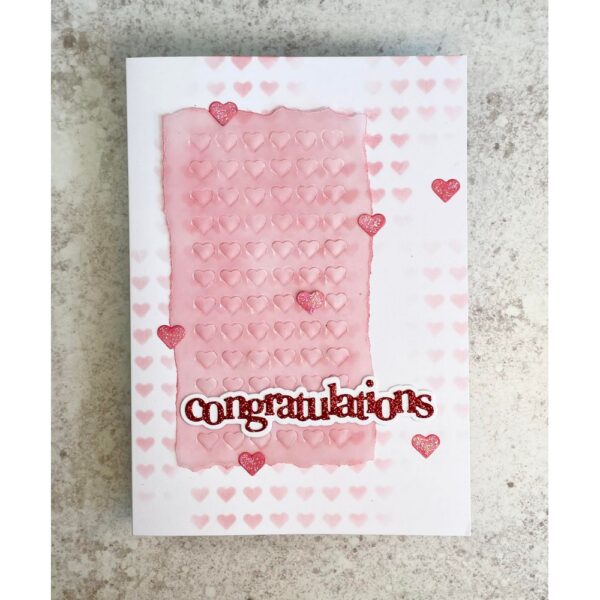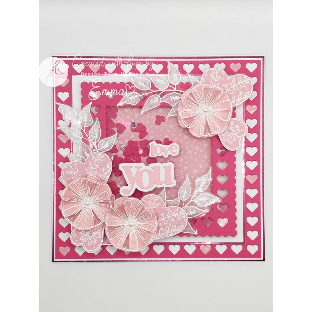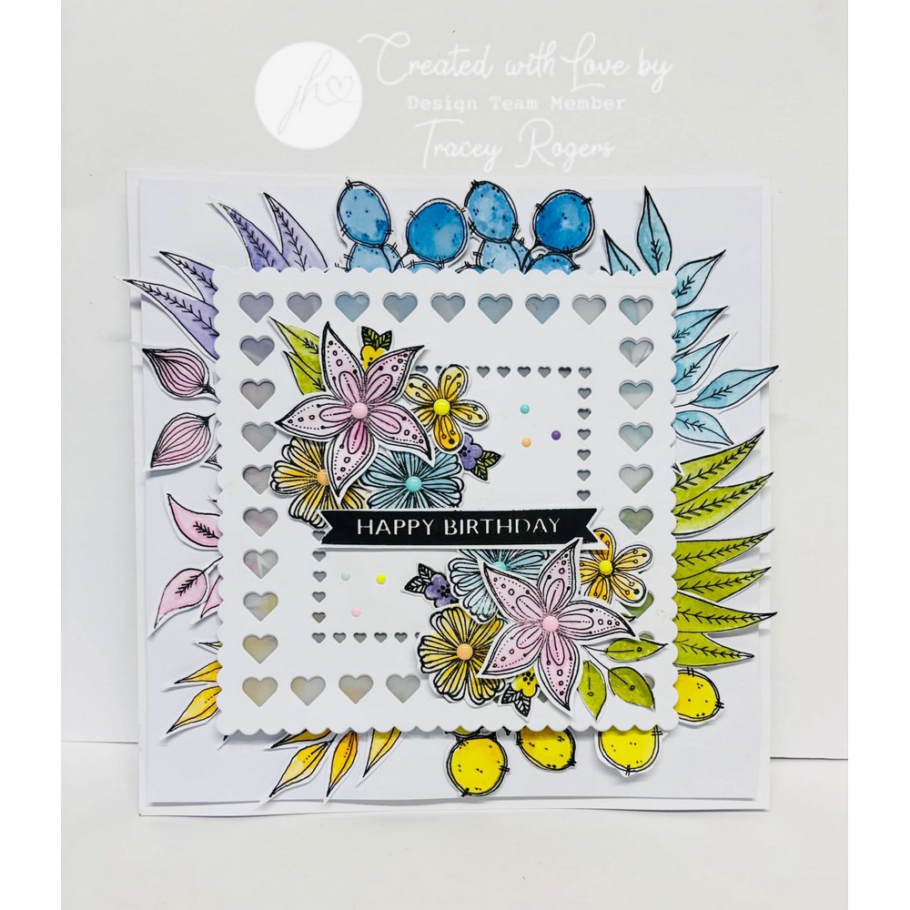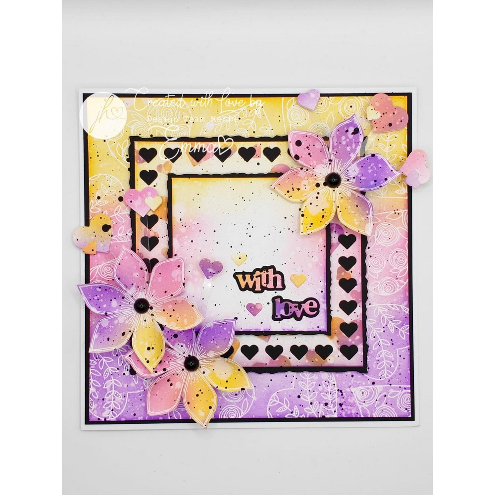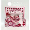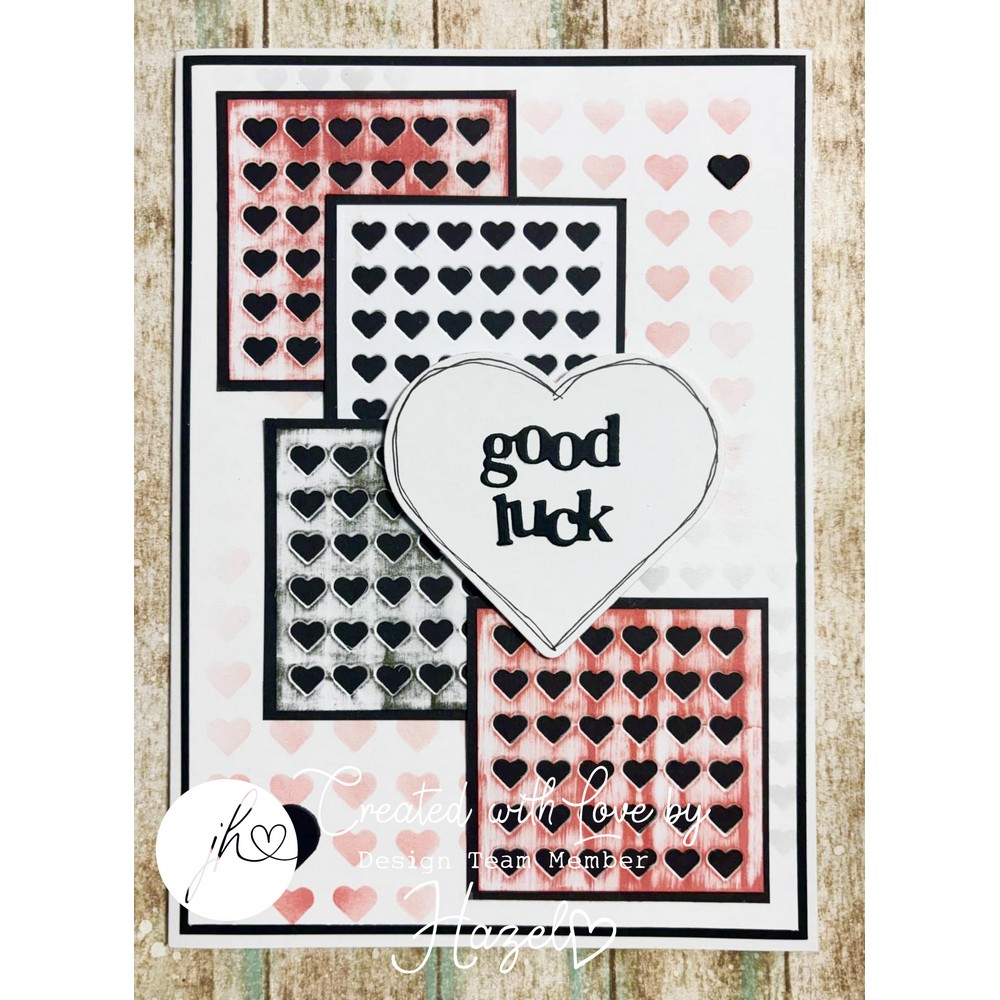 Hazel’s Heart Medley Die Set comprising: 11 individual dies, 6 layering square dies, 1 tag die and 4 heart dies. The largest heart die fits a 150mm x 150mm (6″x6″) card blank perfectly and all the aperture dies can be extended creating lots of different sizes. The dies can be using independently to create mats and layers into cards or they can be combined to create frames with heart apertures. The dies also make fabulous stencils to use for your card making.