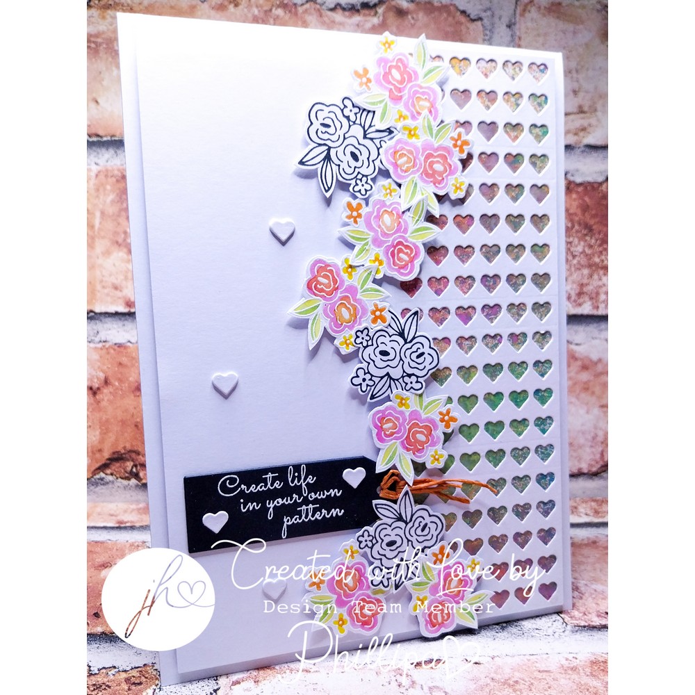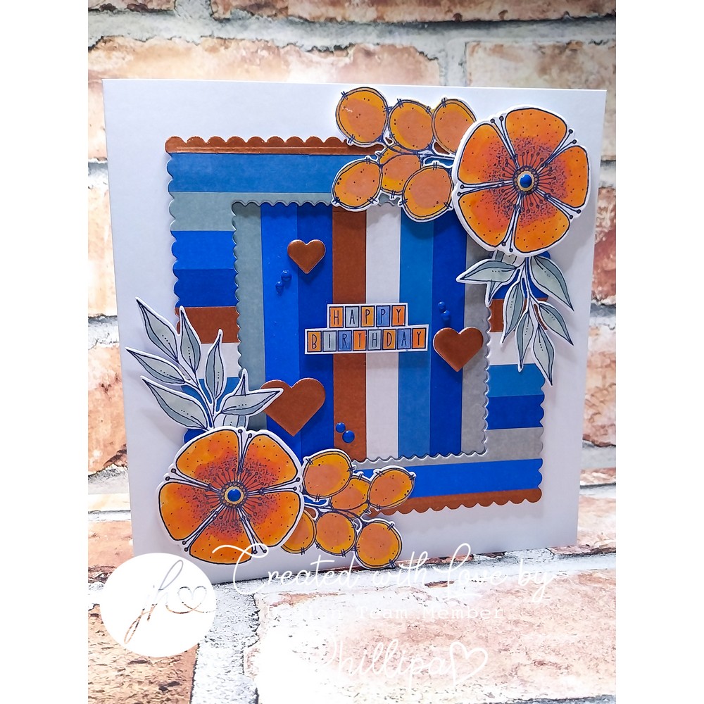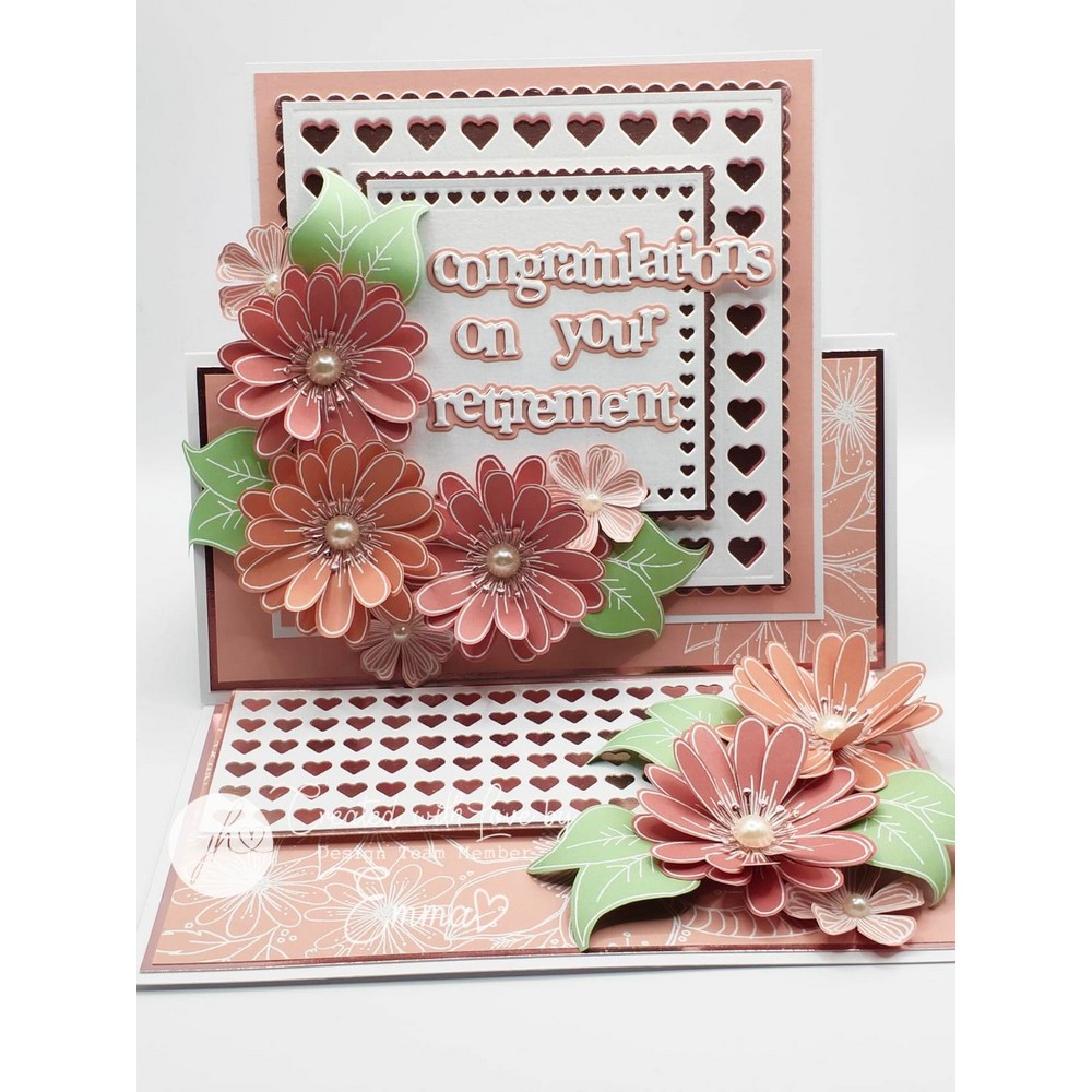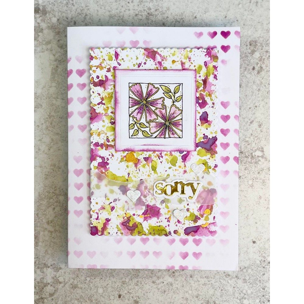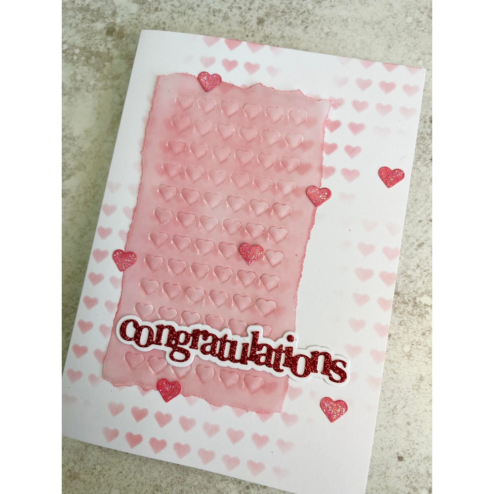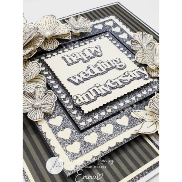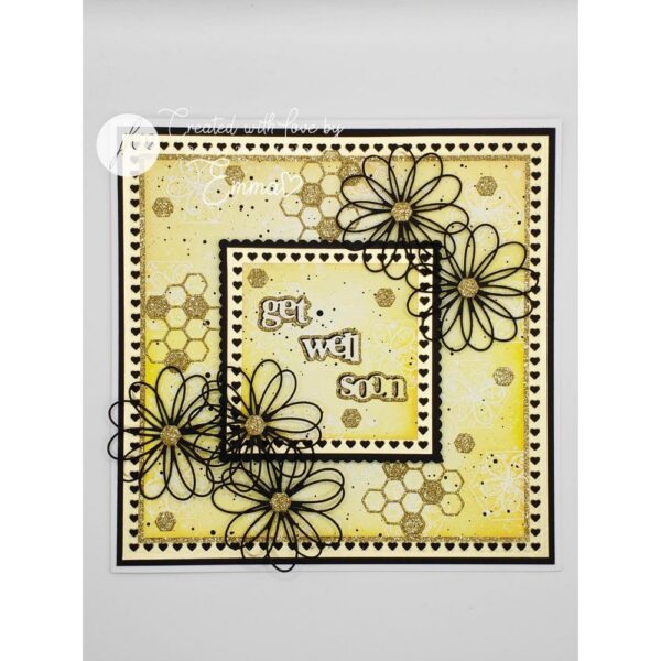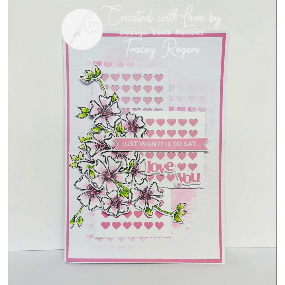 Hazel’s Heart Medley Die Set comprising: 11 individual dies, 6 layering square dies, 1 tag die and 4 heart dies. The largest heart die fits a 150mm x 150mm (6″x6″) card blank perfectly and all the aperture dies can be extended creating lots of different sizes. The dies can be using independently to create mats and layers into cards or they can be combined to create frames with heart apertures. The dies also make fabulous stencils to use for your card making.