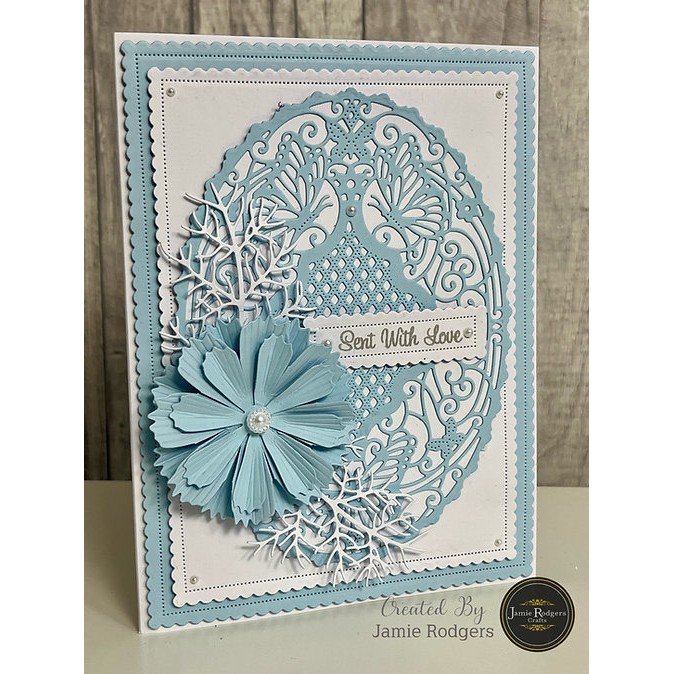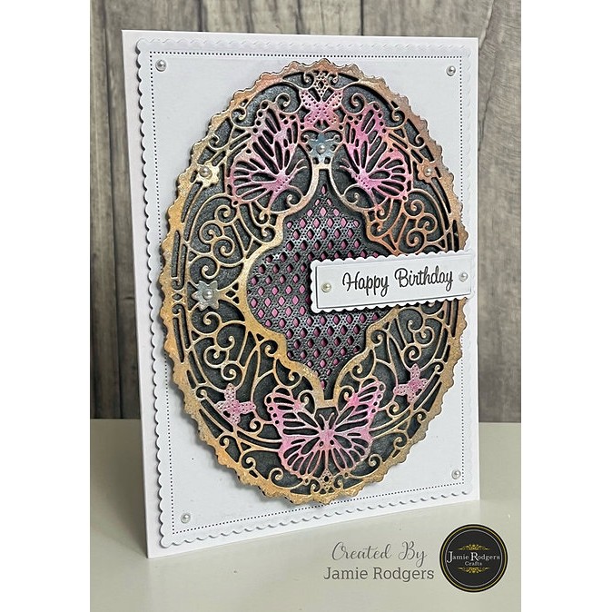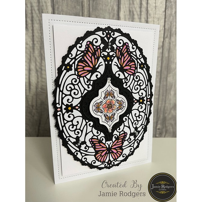 Jamie’s approach as a Designer, is to make his Collections interchangeable and complement each other. The gorgeous butterflies within the oval of this die set, match the butterflies from his