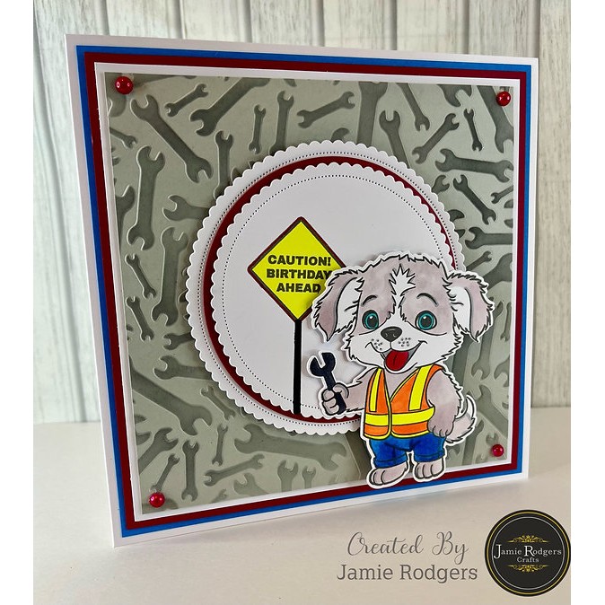 Hazardous Henry Dog Stamp & Die Set (jrcds002) is part of Jamie Rodgers Crafts adorable Cuddly Clan Collection.
