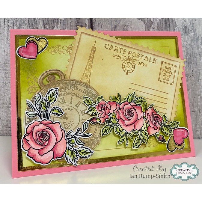 This set includes 6 steel dies and 14 clear stamps, featuring iconic and decorative designs such as the Eiffel Tower, rose and heart corner details, and heart tags. The coordinating stamps include romantic and versatile sentiments like “Valentine,” “I Love You,” “Be Mine,” and “Good Luck,” along with a vintage ornate clock for added classic detail. Stamps and dies are designed to work together seamlessly for easy layering and precise die-cutting.