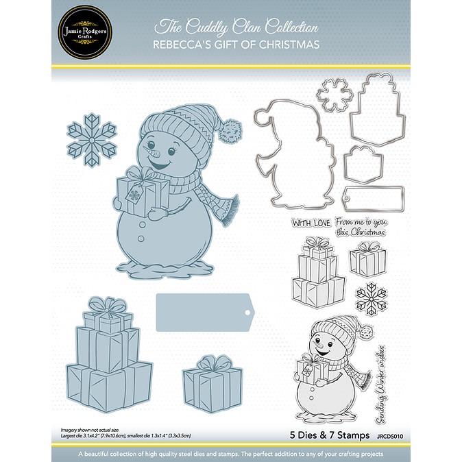 – 5 Dies and 7 Stamps (including Rebecca Snowwoman, Presents & Gifts, Tag, Snowflake and 3 Sentiments)