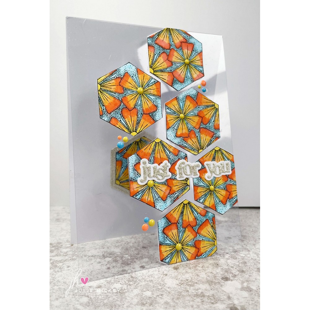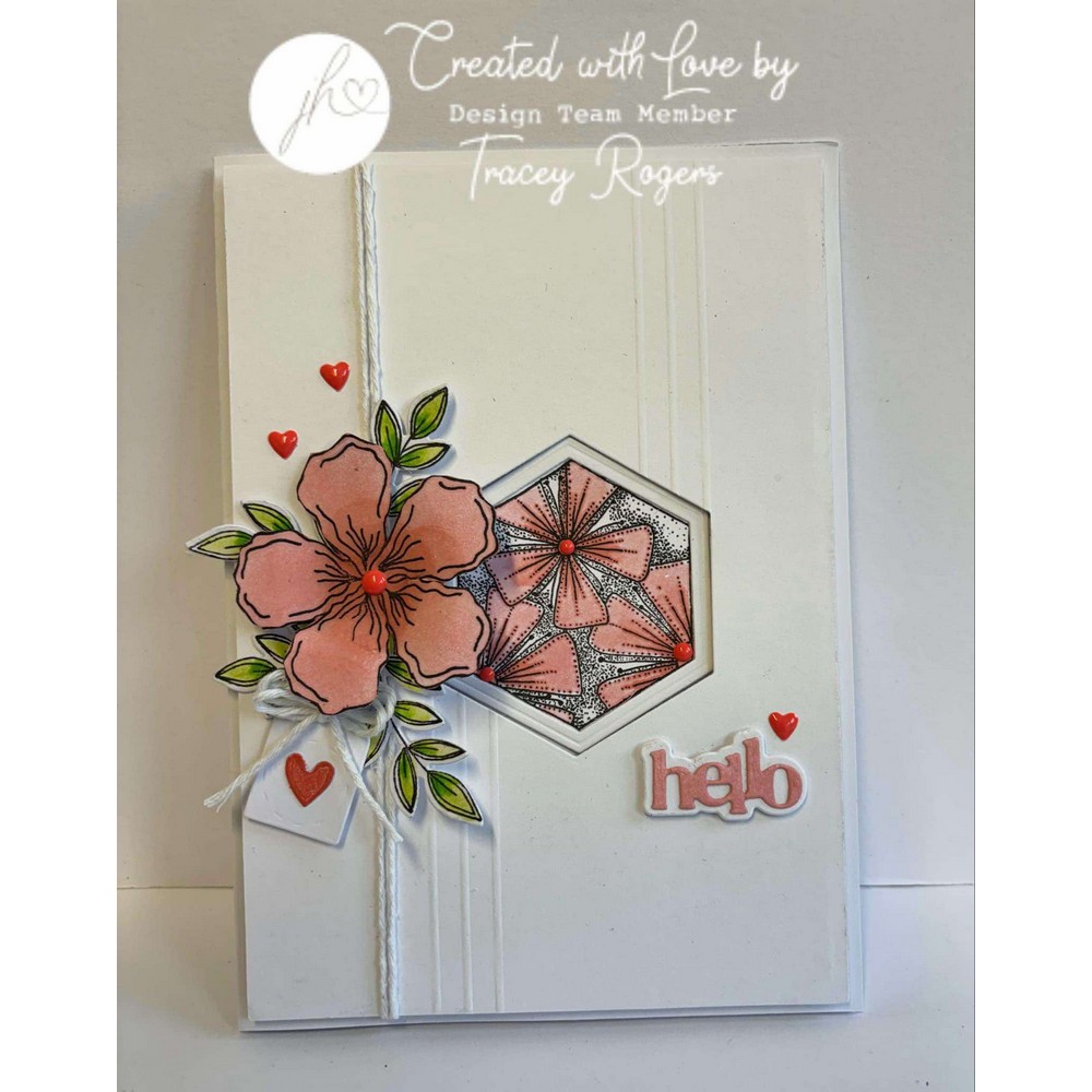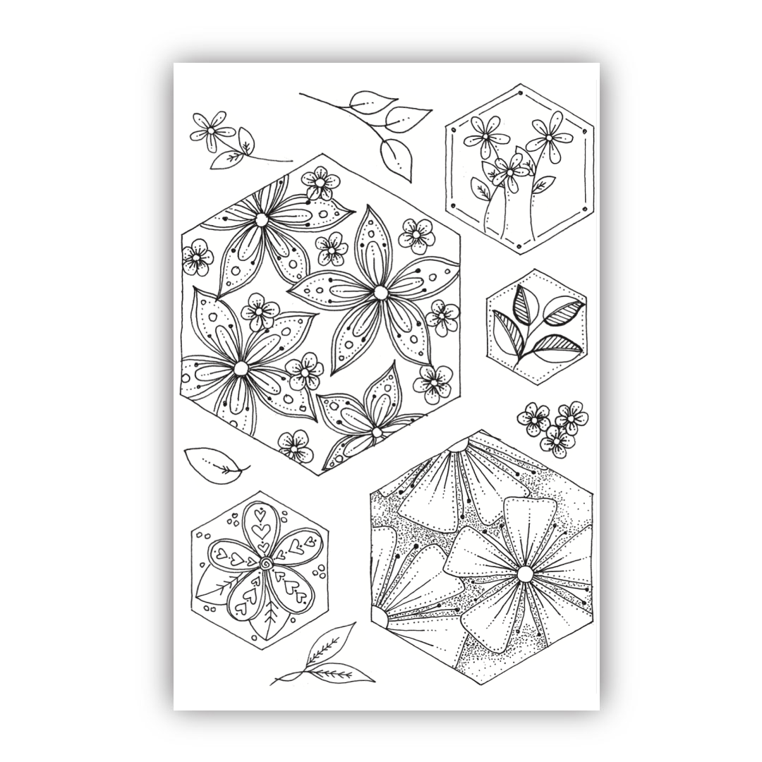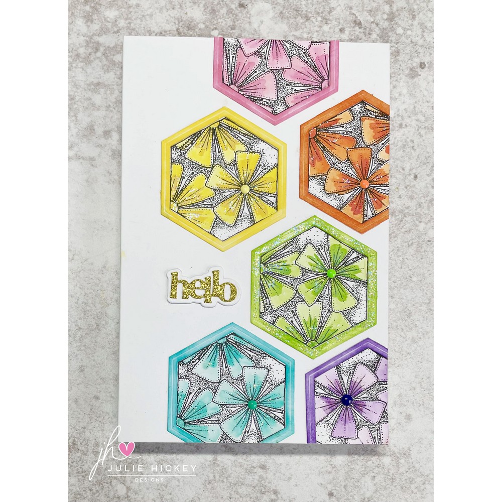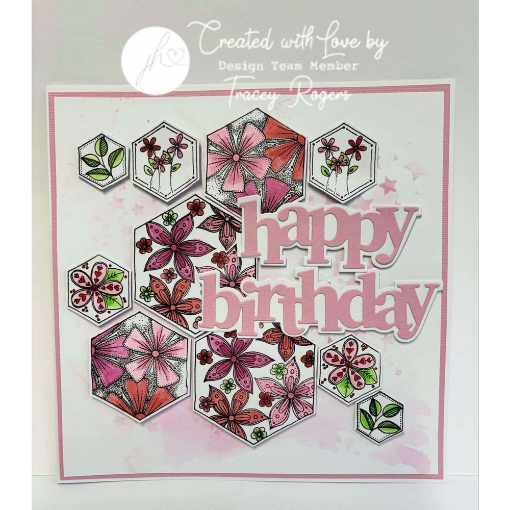 10 individual stamps featuring beautiful contemporary hand drawn blooms in Julie’s signature style. 5 different sized hexagon filled with blooms and leaves. 5 small individual designs including single daisy, cluster of daisy heads and 3 different leaf designs. These stamps co-ordinate perfectly with my Dinky Hexagon Die Set (JHD-CUT-1032), so you can stamp and die cut the image.
