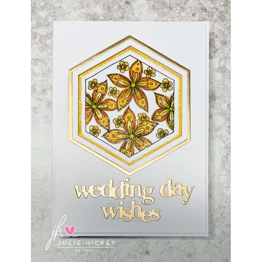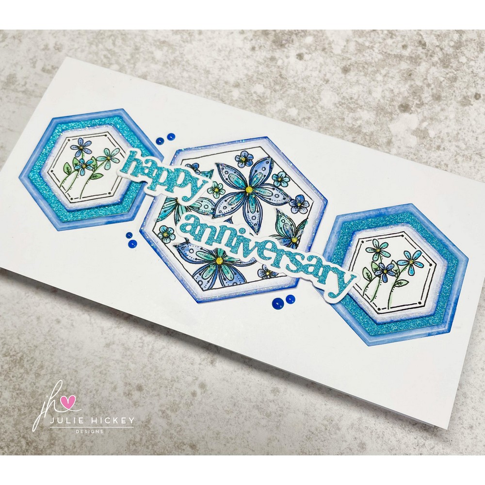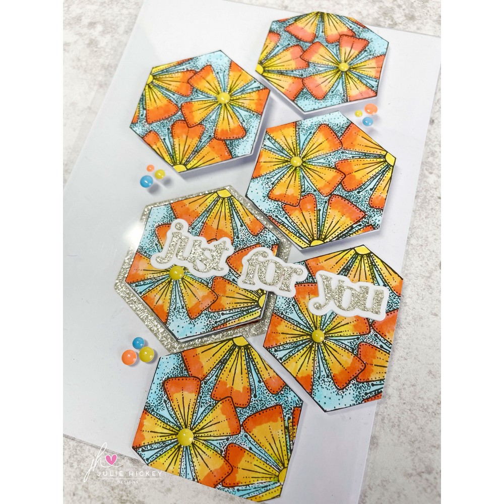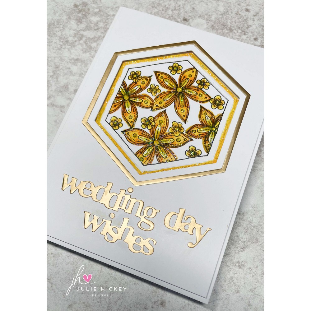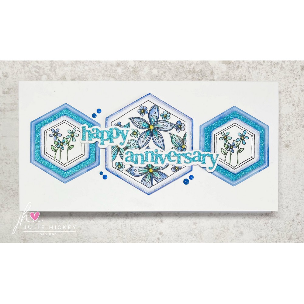 10 individual stamps featuring beautiful contemporary hand drawn blooms in Julie’s signature style. 5 different sized hexagon filled with blooms and leaves. 5 small individual designs including single daisy, cluster of daisy heads and 3 different leaf designs. These stamps co-ordinate perfectly with my Dinky Hexagon Die Set (JHD-CUT-1032), so you can stamp and die cut the image.