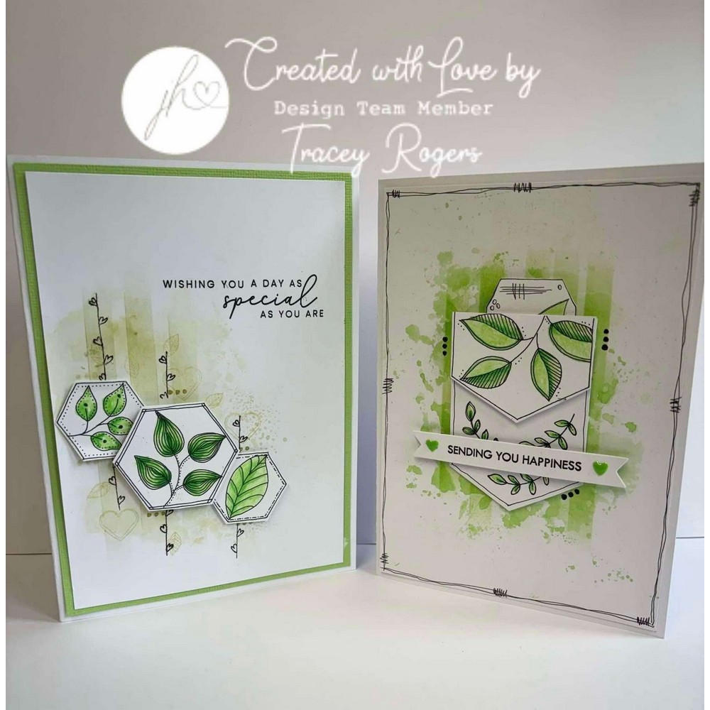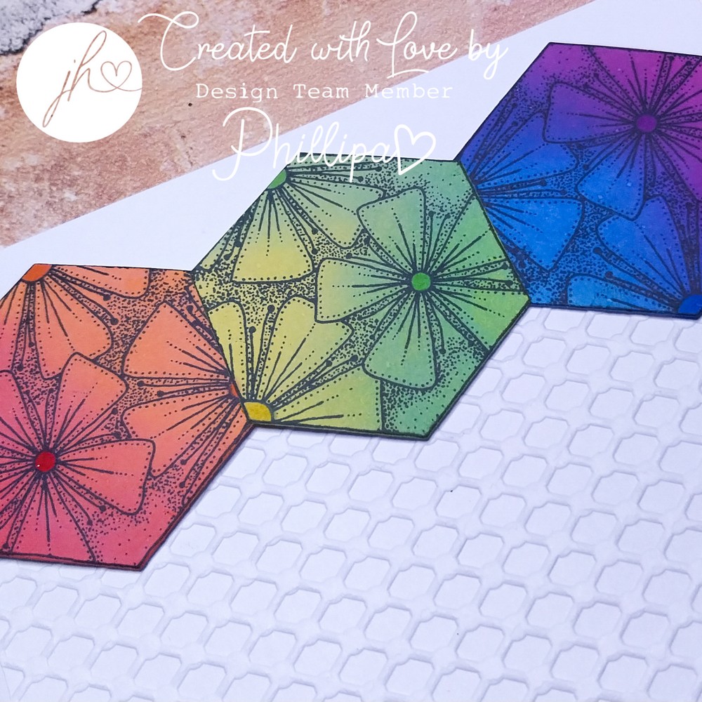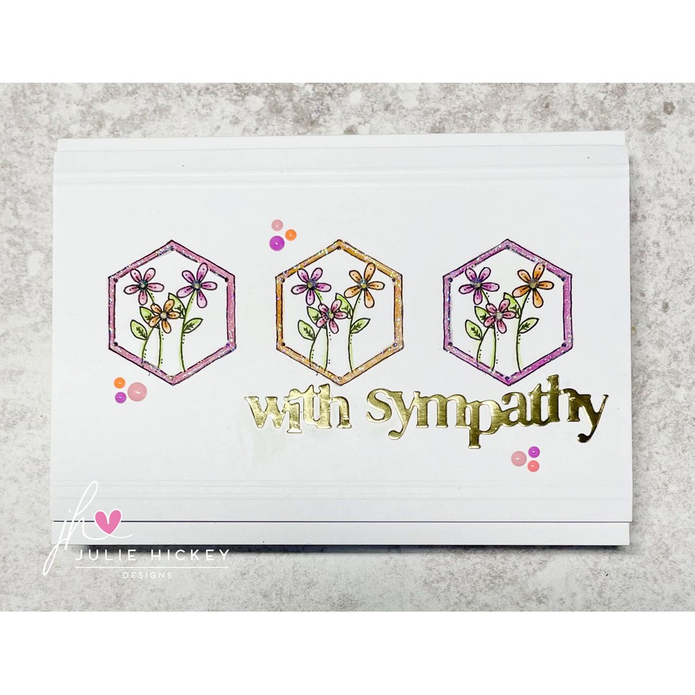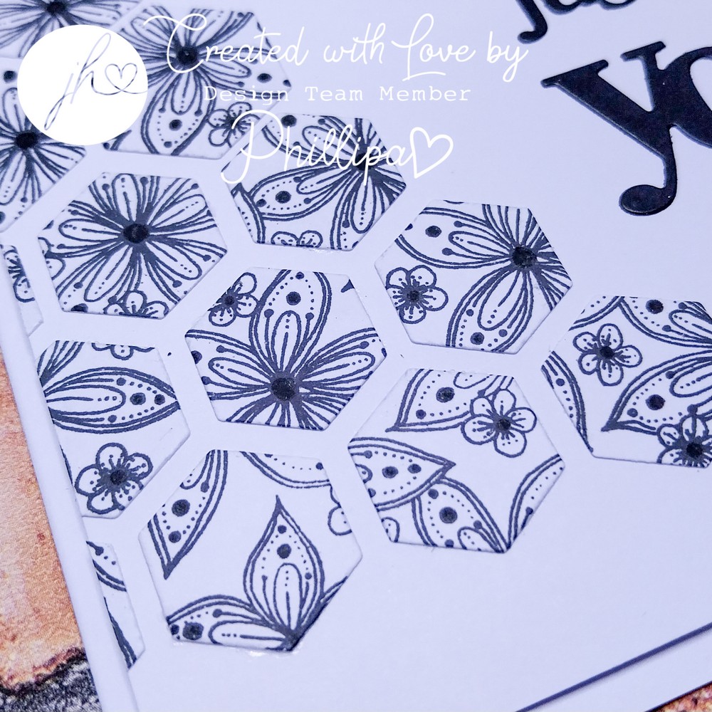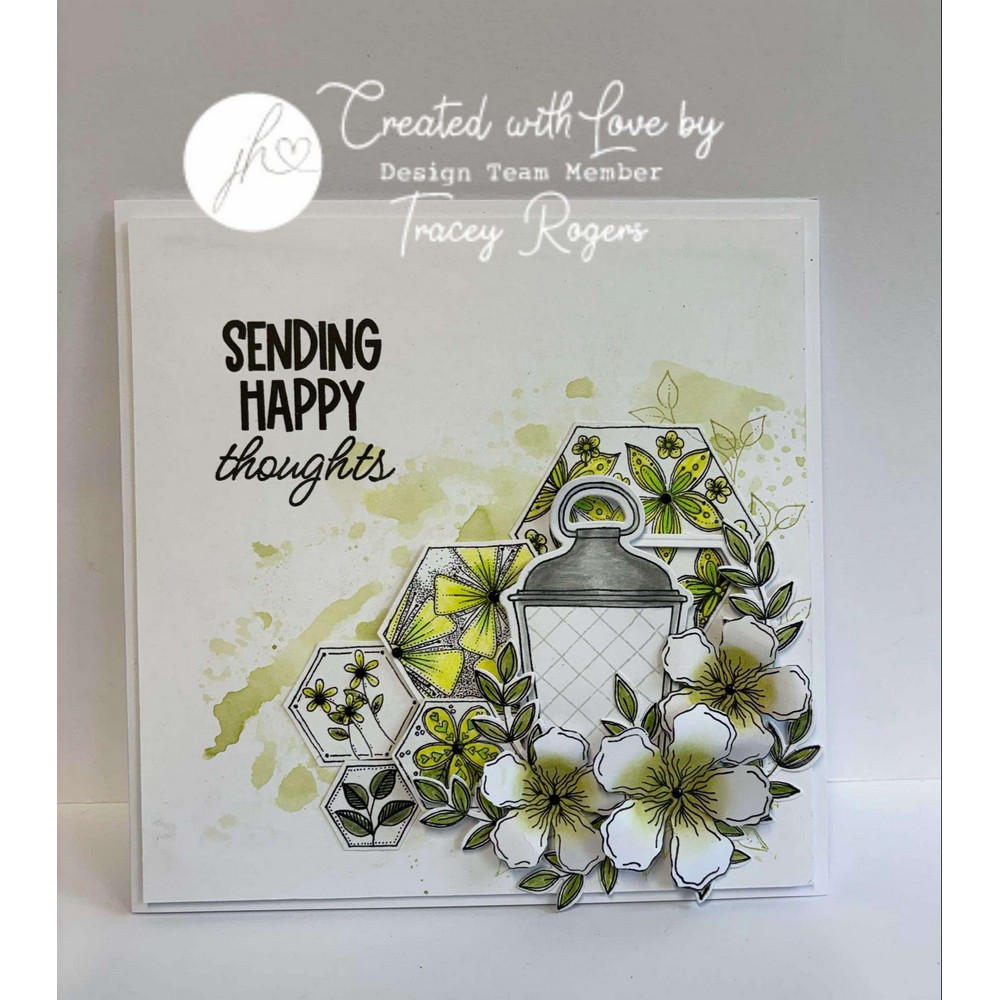 10 individual stamps featuring beautiful contemporary hand drawn blooms in Julie’s signature style. 5 different sized hexagon filled with blooms and leaves. 5 small individual designs including single daisy, cluster of daisy heads and 3 different leaf designs. These stamps co-ordinate perfectly with my Dinky Hexagon Die Set (JHD-CUT-1032), so you can stamp and die cut the image.