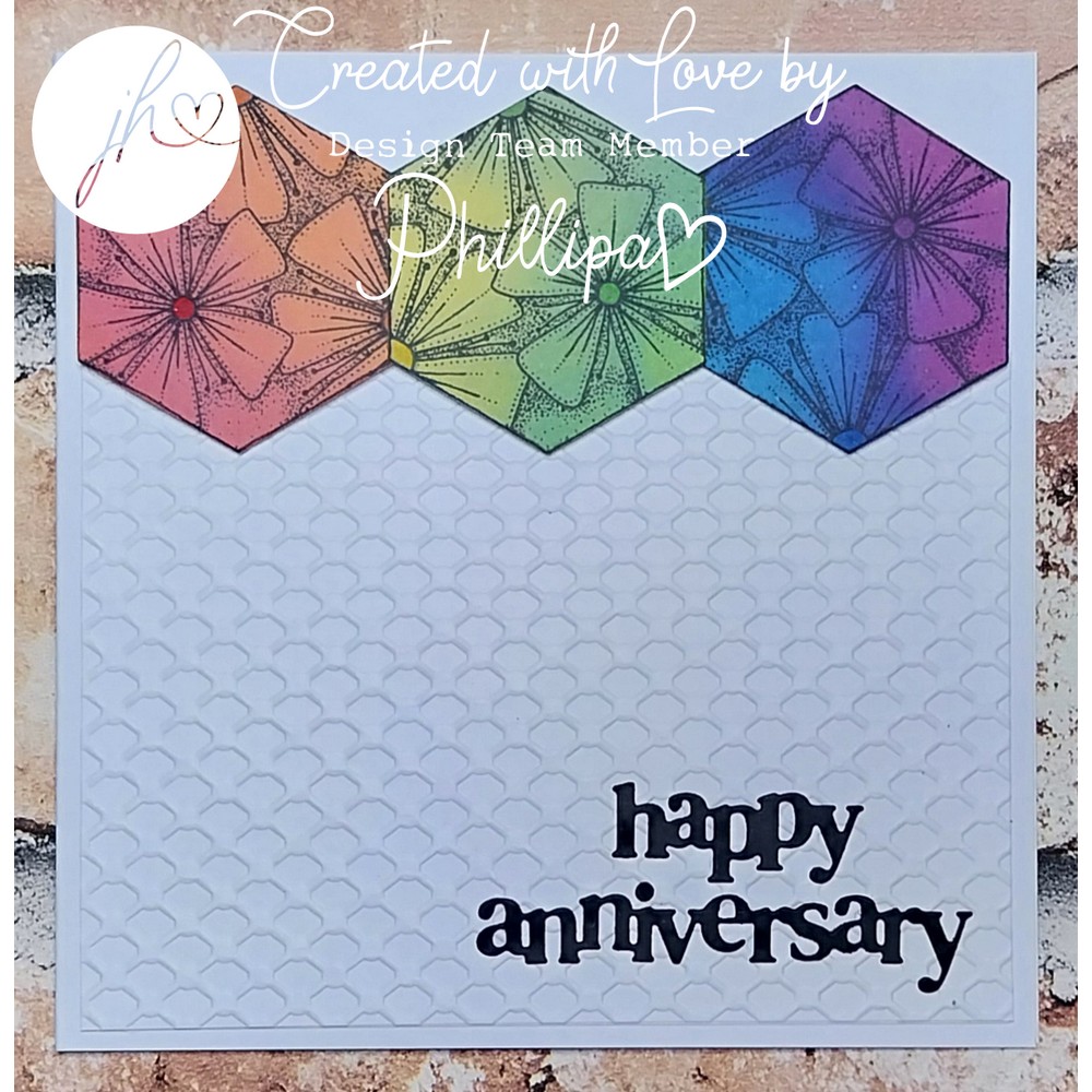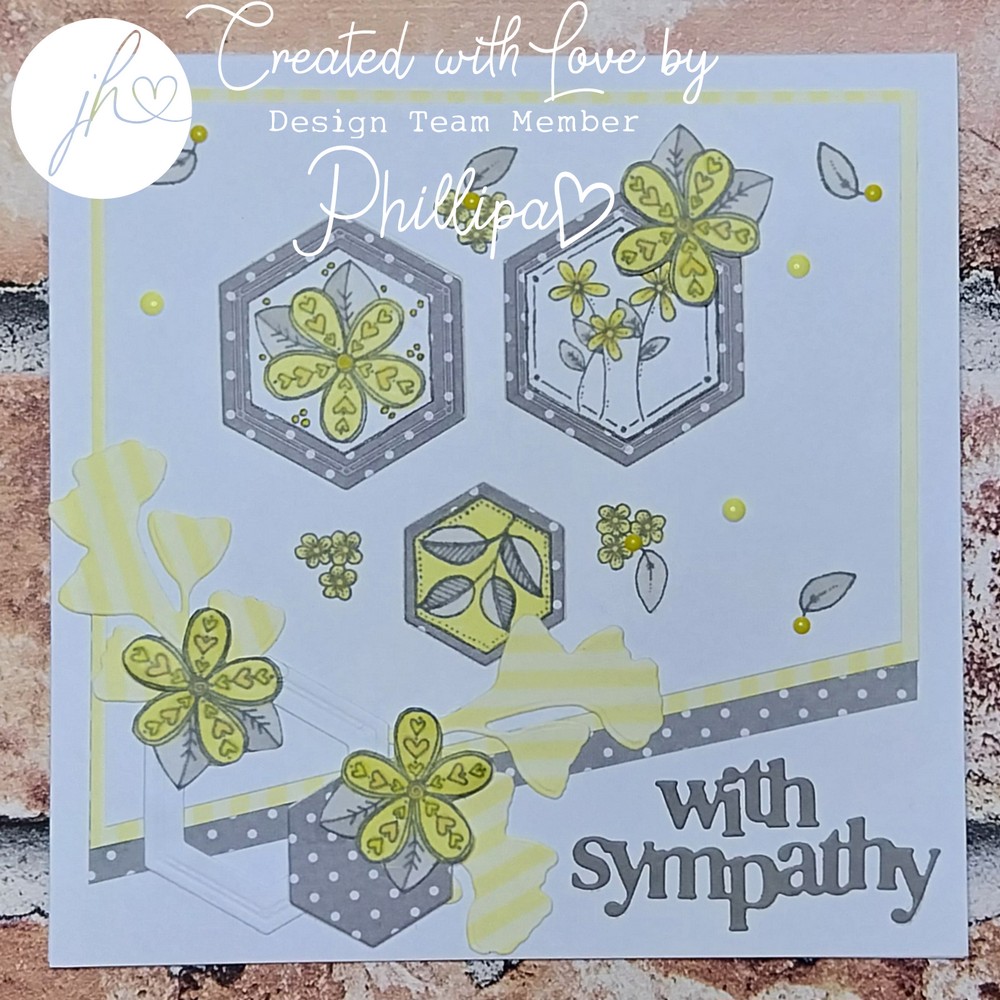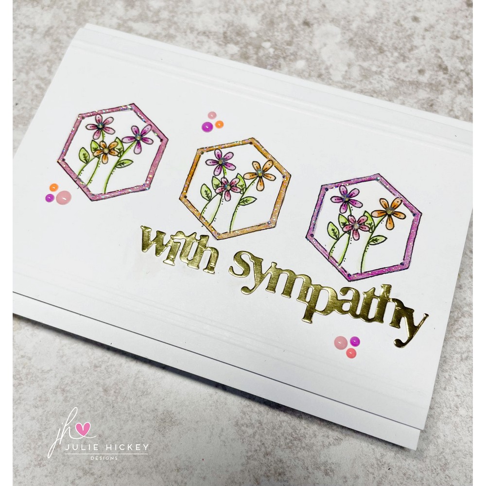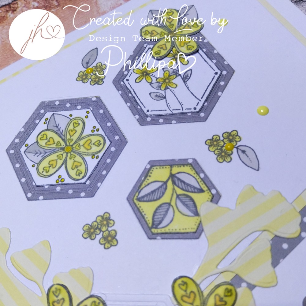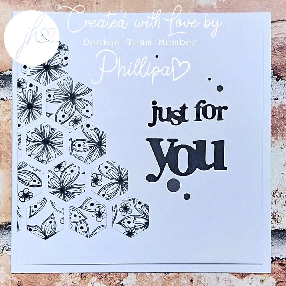 10 individual stamps featuring beautiful contemporary hand drawn blooms in Julie’s signature style. 5 different sized hexagon filled with blooms and leaves. 5 small individual designs including single daisy, cluster of daisy heads and 3 different leaf designs. These stamps co-ordinate perfectly with my Dinky Hexagon Die Set (JHD-CUT-1032), so you can stamp and die cut the image.