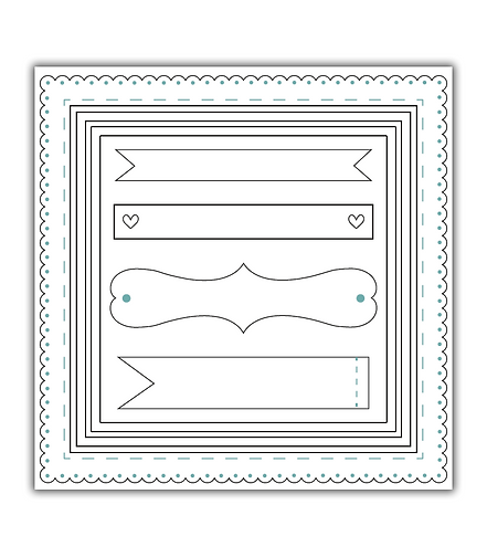 Set of layers, frames and banners in square shape which fits a 148mm x 148mm card blank, leaving small border around edge of card. Largest die has scallop edge with embossed dots in each scallop and embossed stitching, 2 skinny square frame dies, single cut square die. 4 different sized and style of banner dies.
