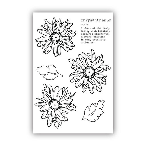 3 beautiful hand illustrated Chrysanthemums with 2 different sized leaves and a dictionary style Chrysanthemum text stamp, hand drawn by Peter Tofalos.