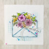 9 individual stamps featuring hand drawn envelope full of Julie’s signature style blooms with additional stamps including heart, 2 daisies, 3 dots and a sprig of foliage. There are a selection of sentiments in Julie’s hand picked fonts including: Sent with Love, Im here for you, Sending Love and Just for You.