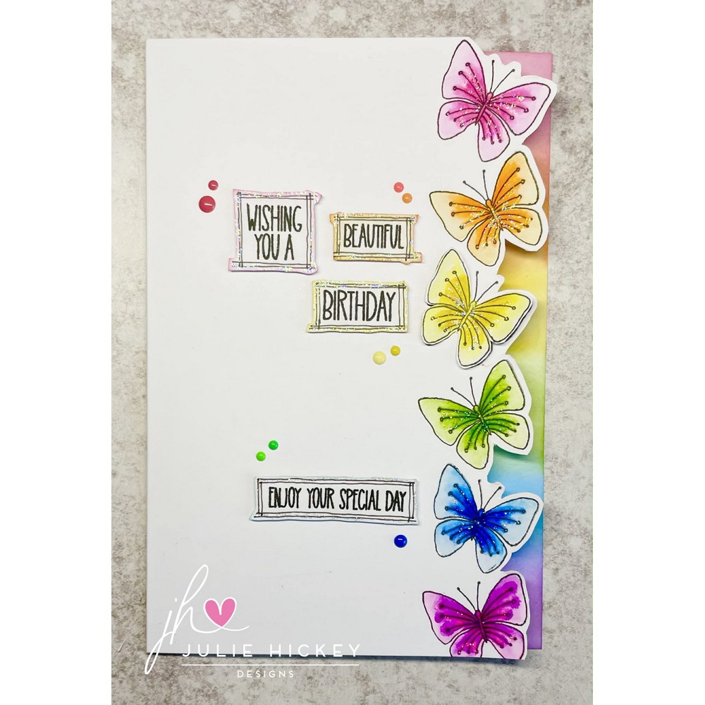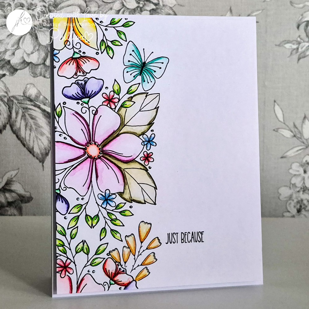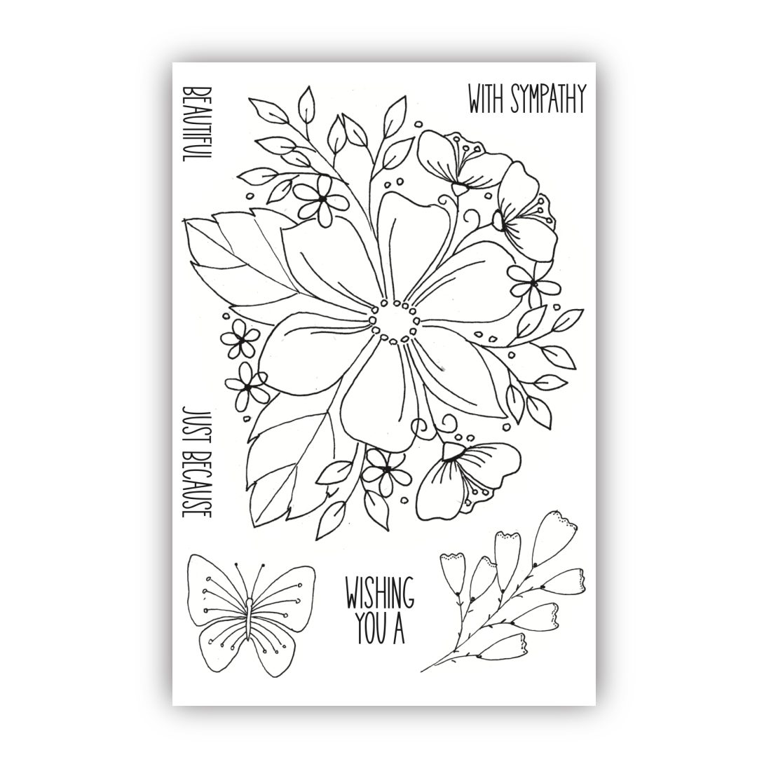 Comprising: 1x large floral design, 1x floral sprig and Butterfly all from Nature’s Garden with 4x sentiments: Wishing you a, Beautiful, Just Because, With Sympathy.