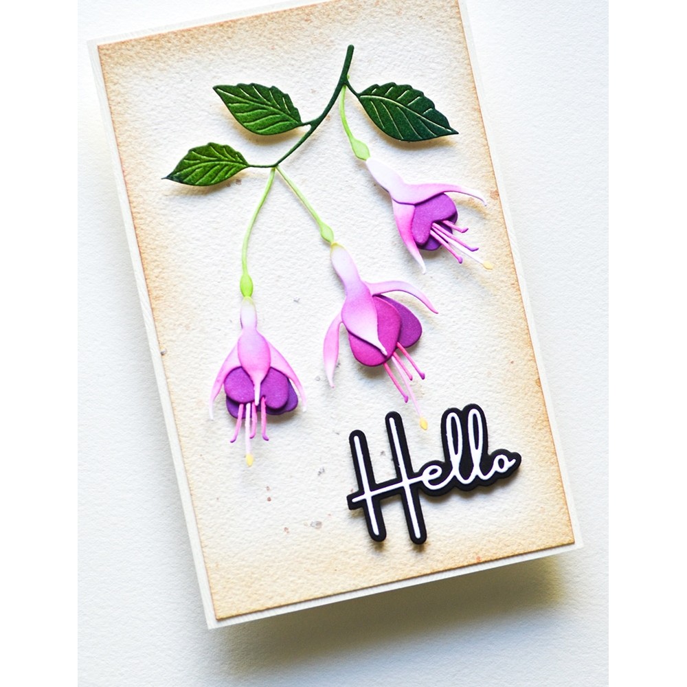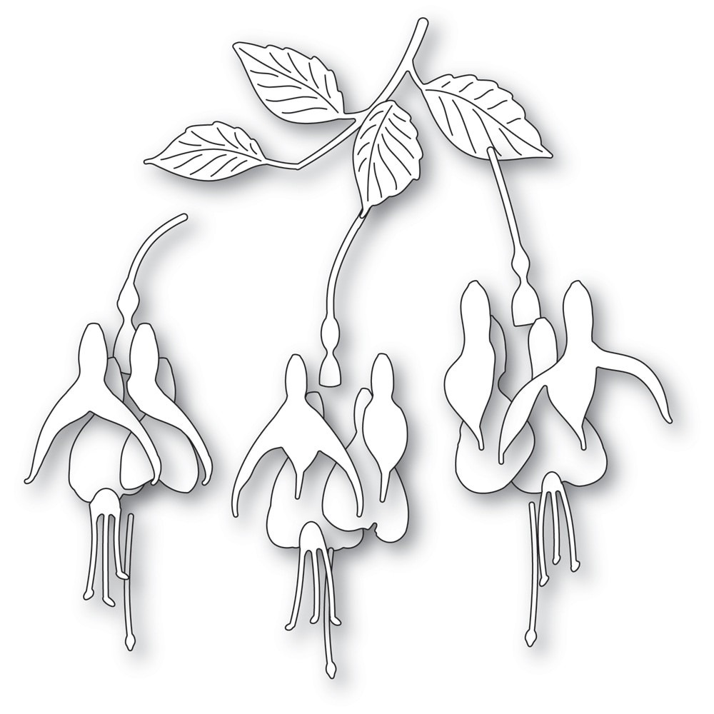 2.8 x 7.6, 2.8 x 9.1, 3.6 x 8.9 centimetres fuchsias assembled, 1.5 x 2.5 centimetres leaf, 8.4 x 3.3 centimetres branch