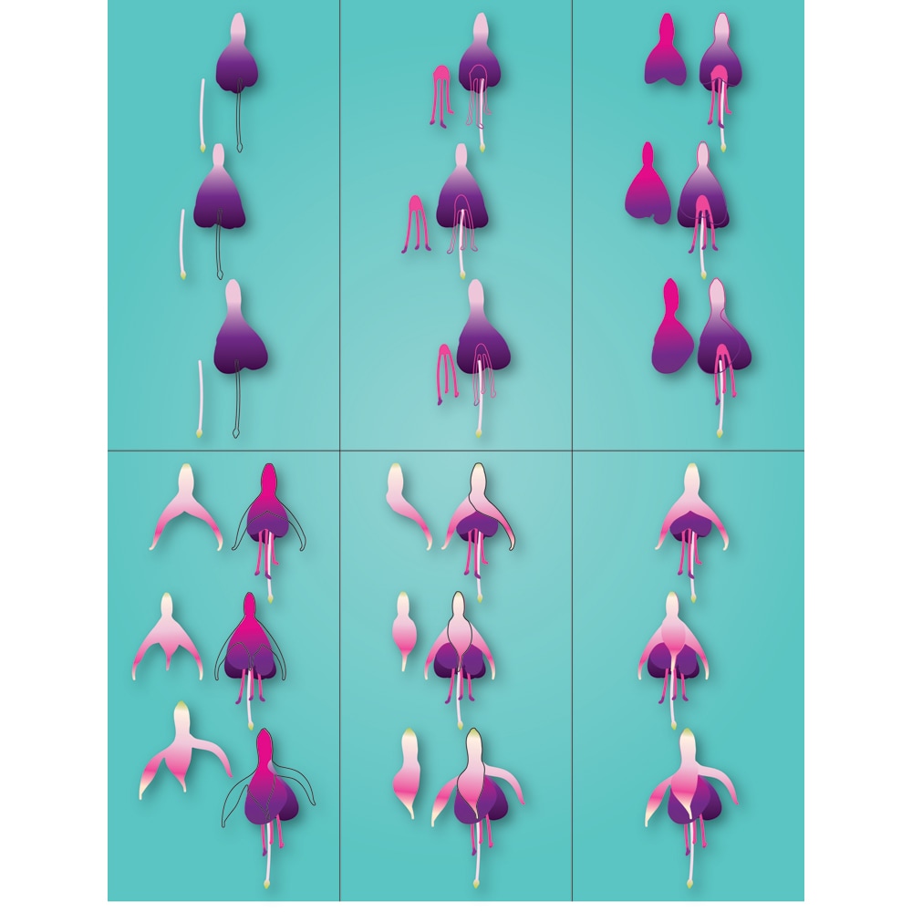 1.1 x 3, 1.1 x 3.6, 1.4 x 3.5 inches fuchsias assembled, 0.6 x 1 inch leaf, 3.3 x 1.3 inches branch