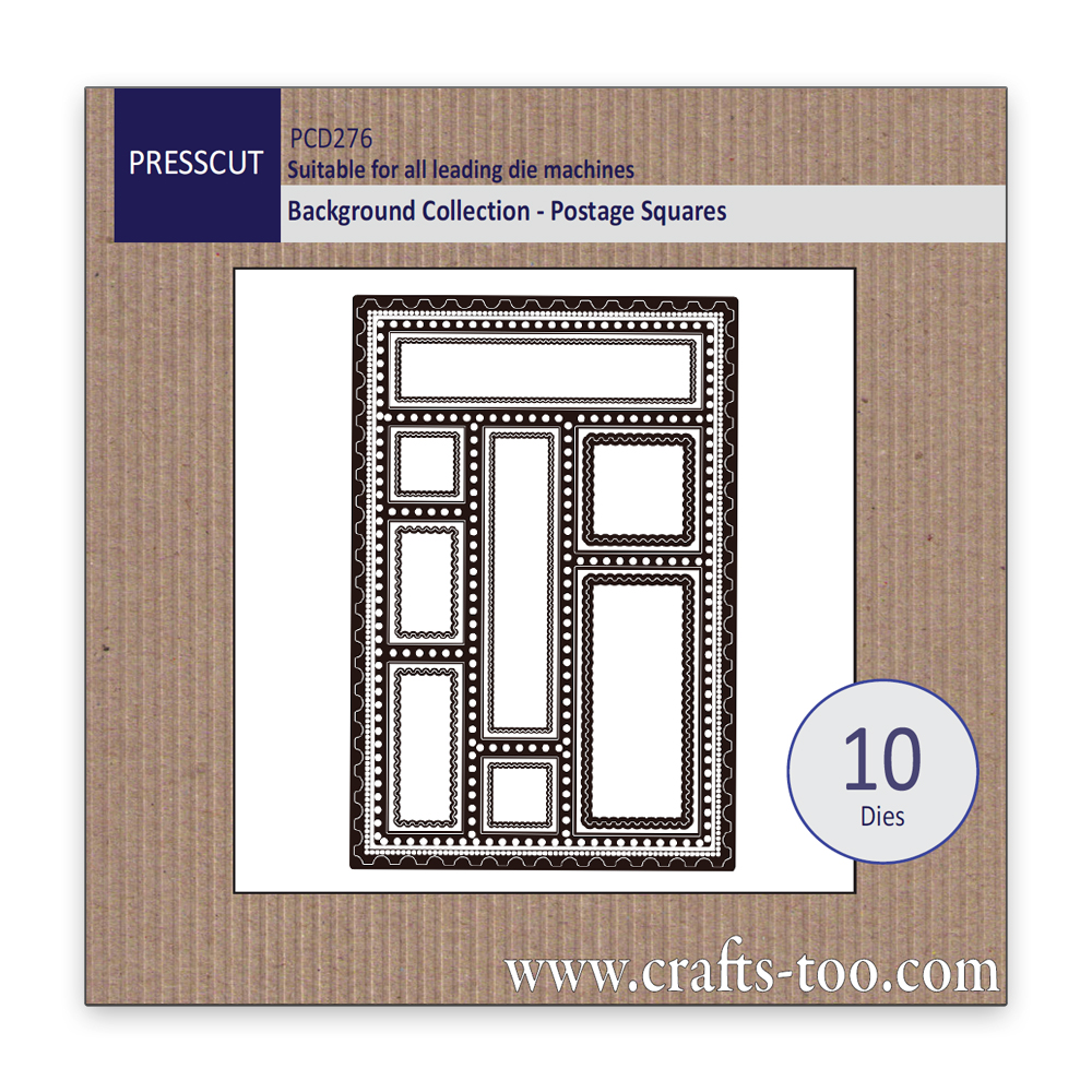 The Presscut Background Collection Postage Squares consists of 10 high quality cutting dies that are made out of steel with a teflon coating for ease of use.
