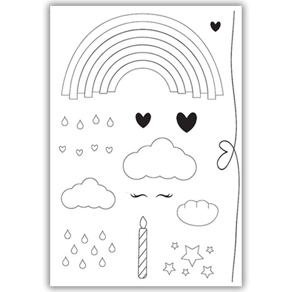 Focal point is a Rainbow, with clouds, raindrops, lashes & hands to hug along with other accessories to work with the rainbow or on their own.