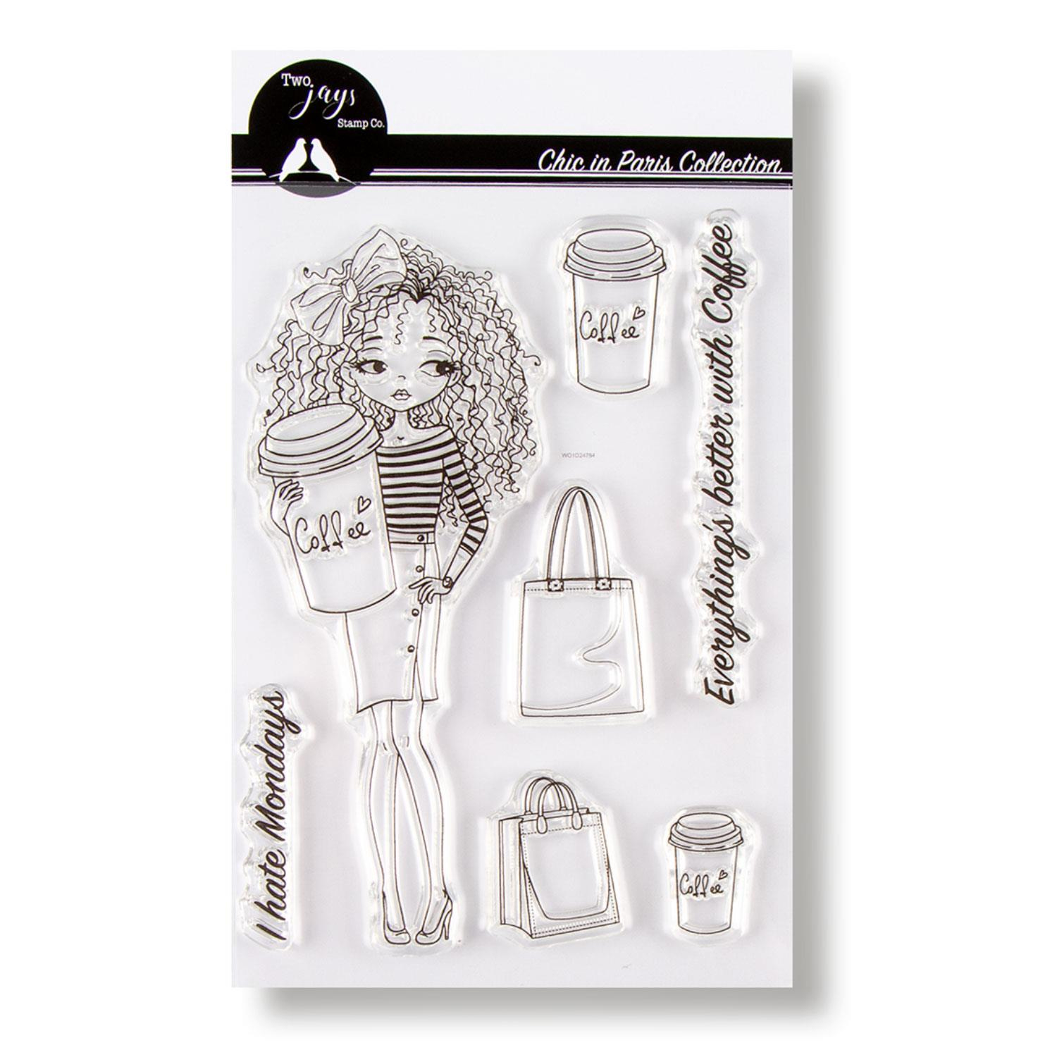 Two Jays Stamp Chic in Paris collection Simone has a total of 7 stamps that are manufactured from a high quality photopolymer. This means that the stamps are clear and that you get a high quality image every time you stamp.