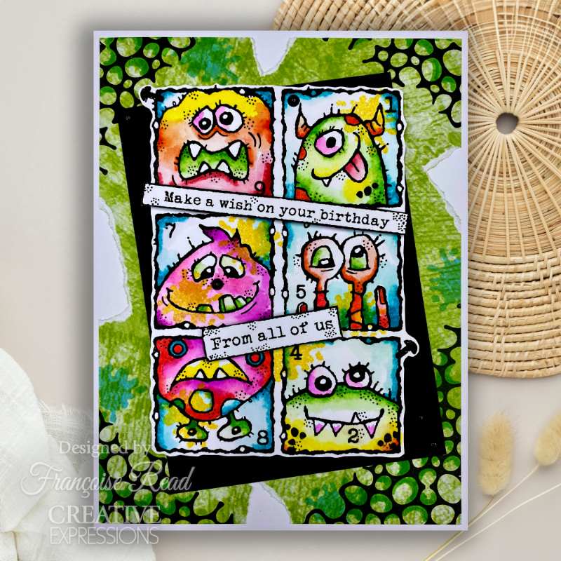 - Includes 3 clear stamps: one large stamp with 6 fun monsters, plus sentiments “Monster Wishes” and “Monster Hugs”