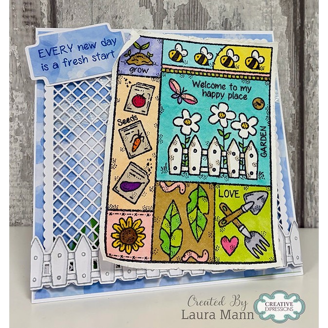 Part of the Norman’s Garden Collection from Woodware and designed by Françoise Read, this A6 clear stamp set features seed packets, seeds, a fence, flowers, bees, leaves, and worms. Includes three cheerful sentiments: “Welcome to My Happy Place,” “LOVE,” and “GARDEN.” Perfect for gardening-themed cards, scrapbooking, and a variety of whimsical papercraft projects.
