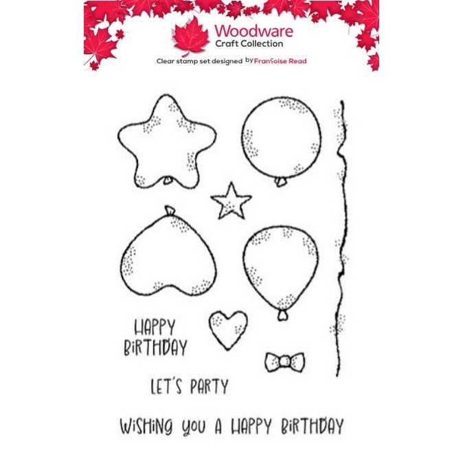 Part of the Woodware Clear Stamp Collection and designed by Françoise Read, this A6 clear stamp set features a variety of playful balloon illustrations along with coordinating accent stamps.