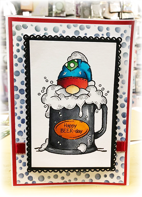 Stamp the beer gnome onto white card and colour – this sample has been beautifully coloured with Copic markers by Lesley Lakin