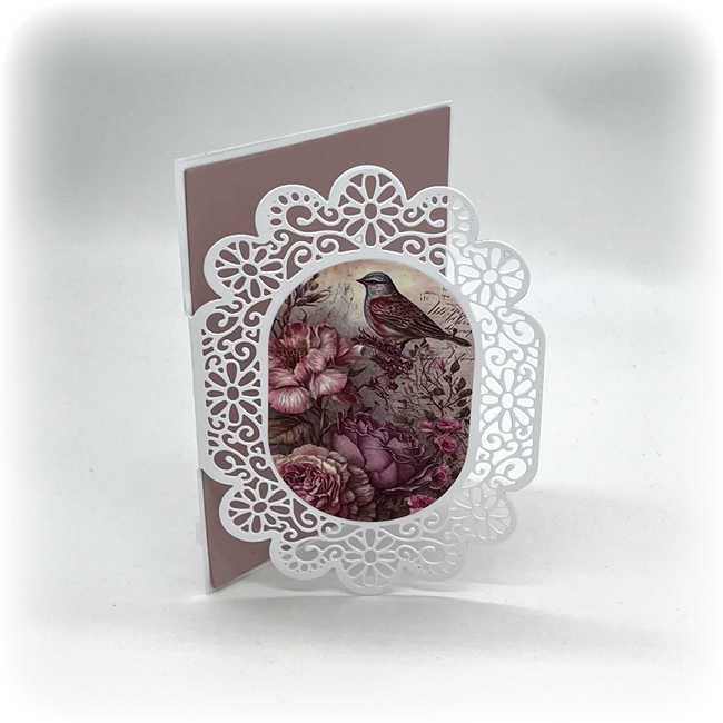 Cut the smaller separate rectangle die in pink to make a panel for the back piece of your card and leave the doily frame with no backing