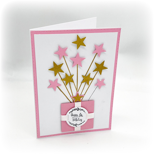 Play around with the positioning of the pink and gold stars until you are happy with the arrangement – use as many or as few as you like. Once you are happy, you will need to add the lines in – you could use a ruler and a black pen or a peel off sticker. Draw these from your star down to where the ‘present’ will cover them towards the bottom. Add your star to the top of the line with foam dots.