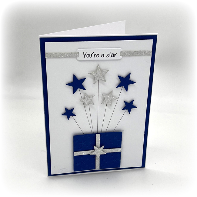 Emboss a 6cm x 5cm scrap of blue card. Cut thin strips of silver glitter card and adhere in a cross to represent ribbon around a parcel and add a silver star to the centre.