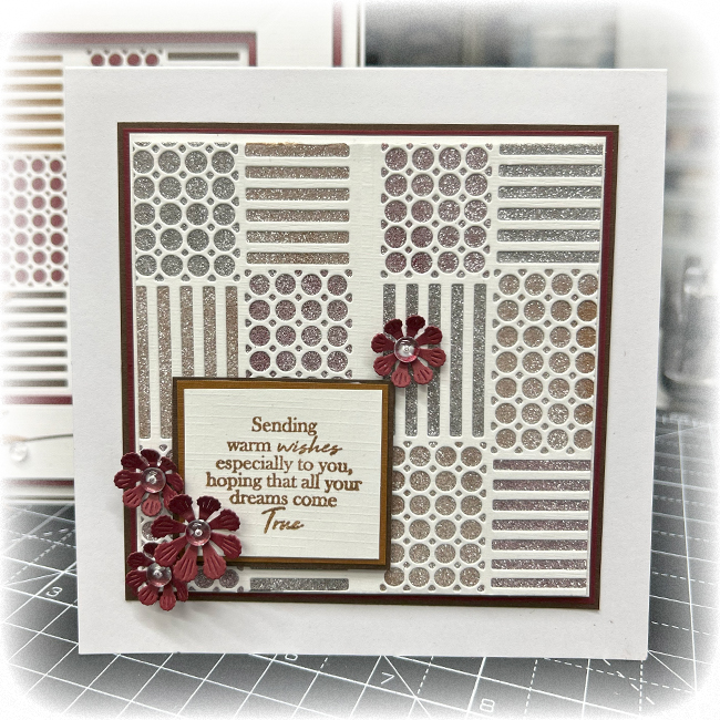 Add to an 8”x8” card blank with a layer of chocolate and white card cut to 7 3/4” square