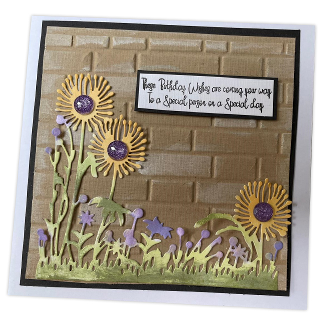 Cut the daisy border twice from black card and adhere to your coloured background (you will just be snipping a few flowers from the second border to extend it to fit along the bottom of the card)