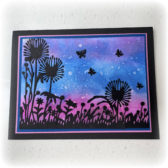 Cut the butterflies from the Elegant Tree die set in black card and dot a a few in the sky