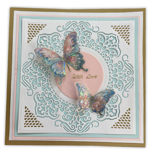 Use a greeting from sticker sheet 324 in gold in the centre and add your gold foiled acetate butterflies (which are available in three different colourways)