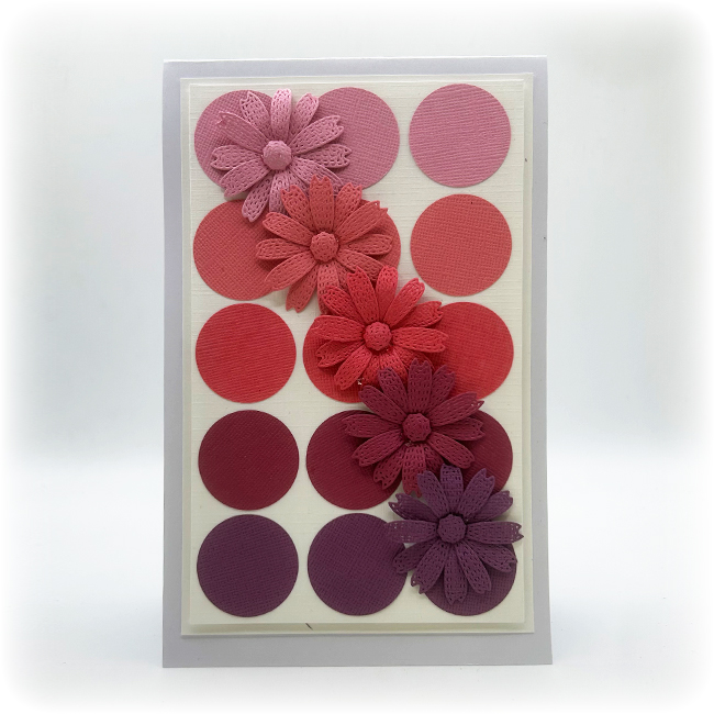 - On a piece of coconut white card cut to 4” x 6 ½” arrange 5 rows of the punched circles in descending colour order I used a mix of colours form the Lilac and Pinks canvas card set