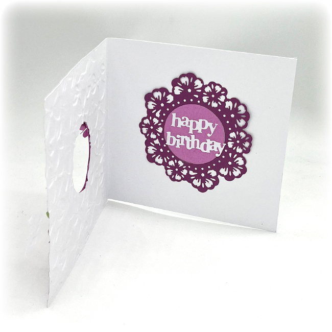 Use a 2″ circle die to cut an aperture in the centre of the front of the card
