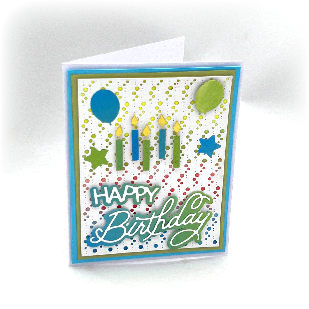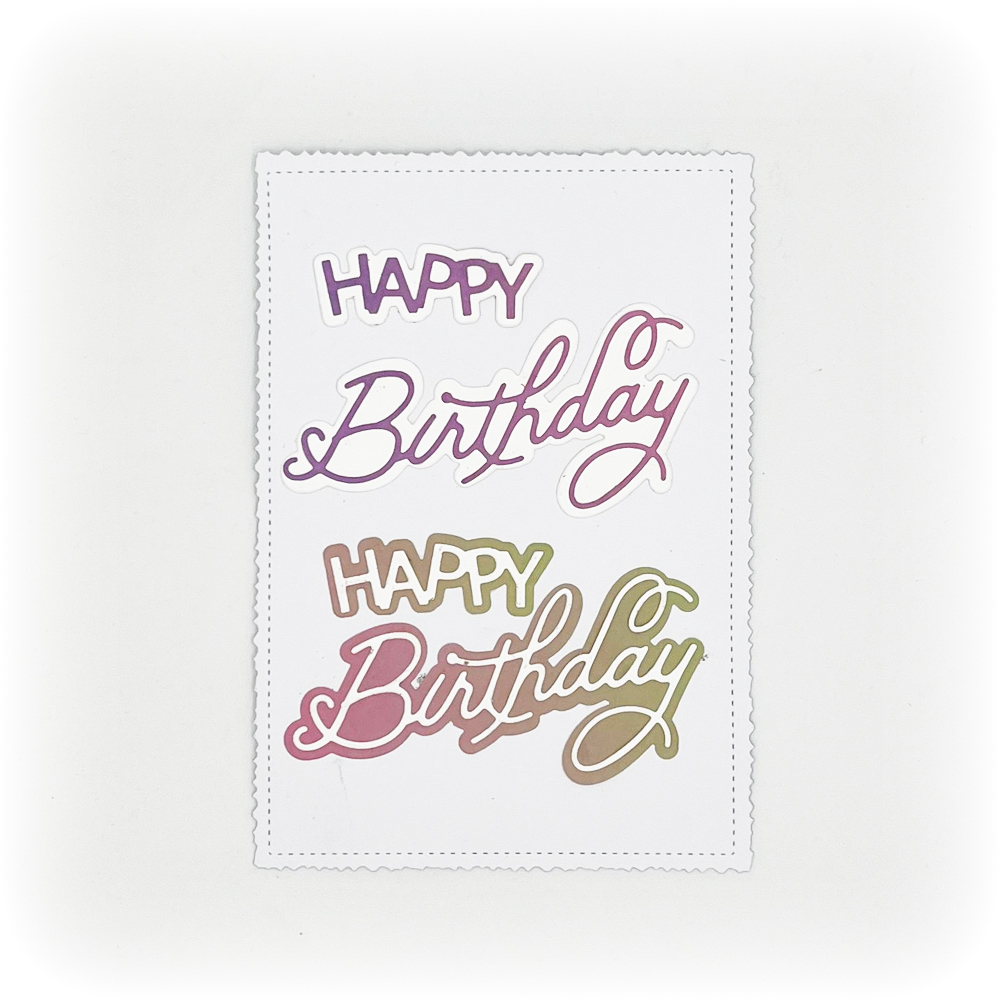 Cut the solid backing from the happy birthday die set from the designer paper pad and then cut the wording in white. Layer together and attach to the card with foam pads